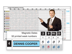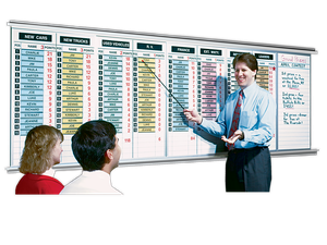 Each magnet shape and color represents a unit sold by make and model (20 codes -14 more available). Display them on this 31-day board opposite the salesperson's name, or instead, use them to track daily or other activity by branches, departments or locations. As the colorful magnets accumulate, a picture of your sales month develops that grabs your attention in time to take sales management action.