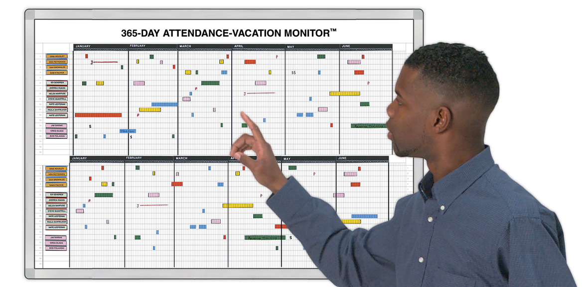 See vacation days, time-off, attendance-absence, training, reviews, travel, etc. while instantly spotting patterns, abuses and opportunities. 3 Sizes for 19, 43 or 86 names. Larger sizes available.