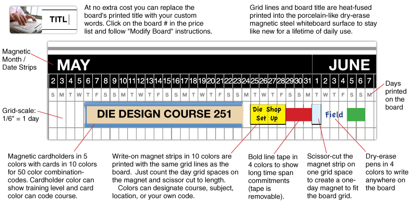 Write-on magnet strips in 10 colors are printed with the same grid lines as the board. Just count the day grid spaces on the magnet and scissor cut to length. Colors can designate course, subject, location, or your own code.