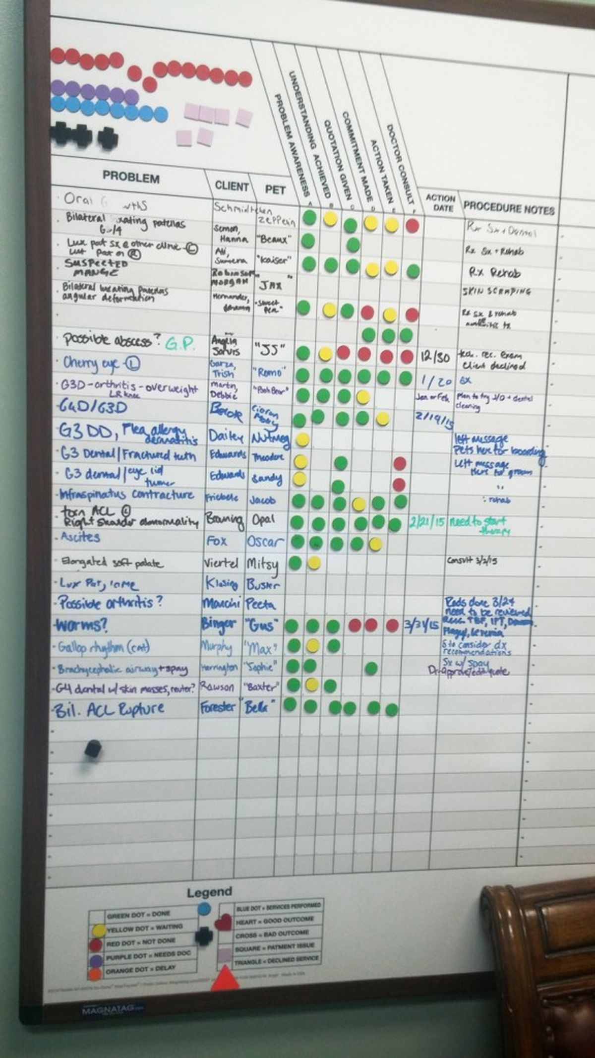For the veterinary visit, Dr. Garner has two systems for keeping track of the visit and the problem the animal is having. To keep track of each visit, he has placed customized health maps on each of the 5 exam room doors to indicate the reason for the animal’s visit, the six-step process of the visit and reference information for staff use. On the problem tracker whiteboard system, problems are recorded for every animal in six stages to keep track of when the client was notified of the animal’s problem and what they decided to do about it.