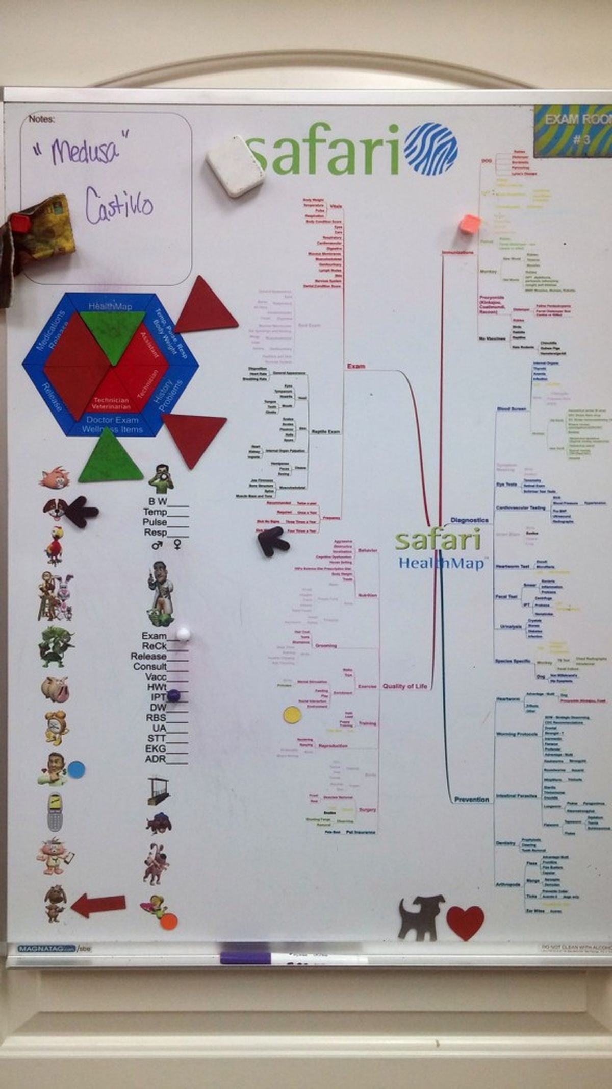 The whiteboard has features such as a hexagon, showing the different stages of the visit that the assistant, the vet technician and veterinarian follow when treating an animal. When a staff member finishes a step, a magnet is moved to the next step of the process, notifying staff that the animal is ready for the next step of the visit.
