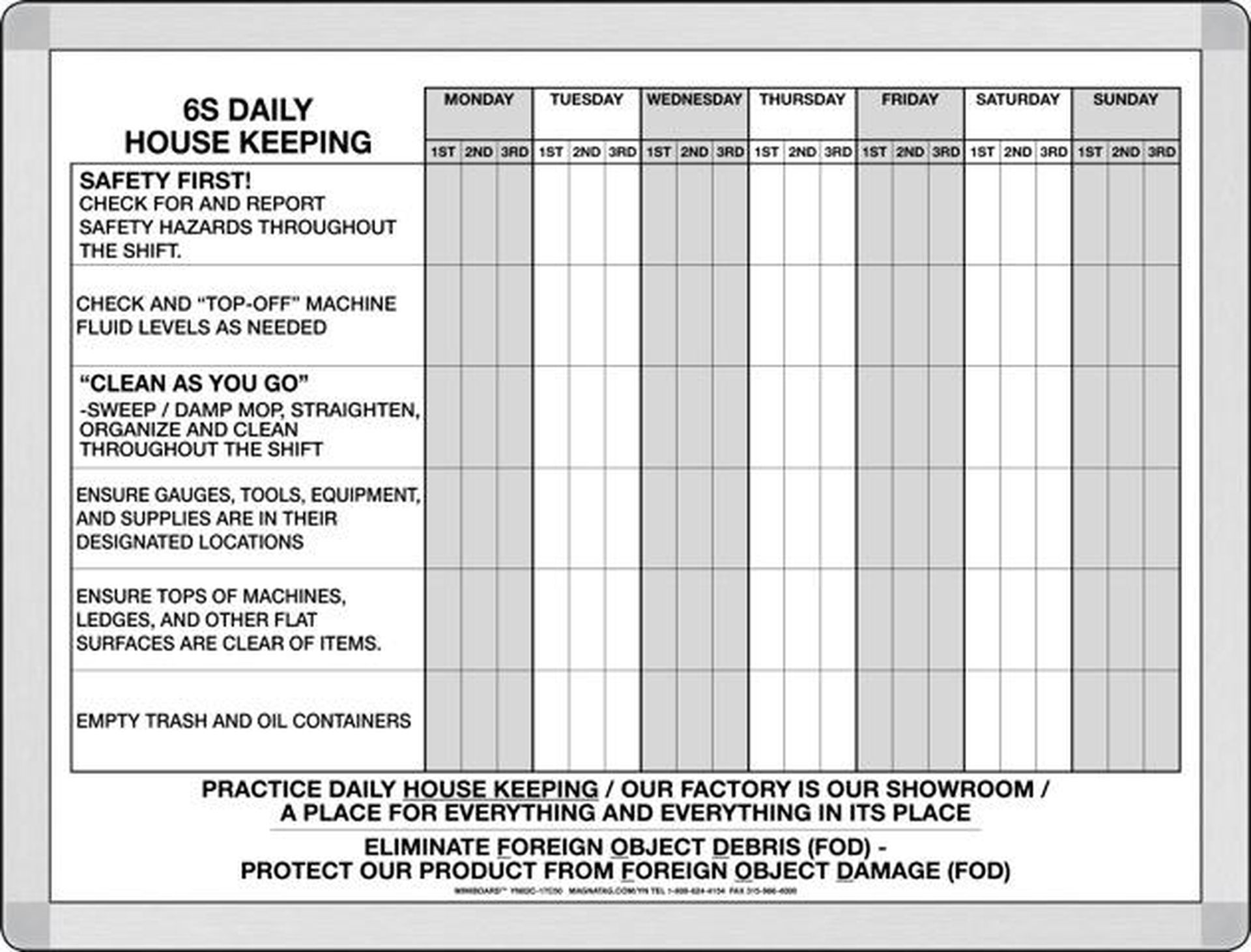 It’s safe to say that if you’re a Magnatag customer, you have a vested interest in visual management. For our manufacturing customers in particular, this comes as part of a continuing drive to incorporate lean manufacturing principals into a factory’s culture. We developed this custom solution to help a Florida-based manufacturing company track and manage their 6S housekeeping method across three separate shifts. Each day of the week has been split into three separate columns, with each representing the 1st, 2nd, and 3rd shift respectfully. Daily housekeeping chores are listed along the left-hand side of the board, with workers expected to complete each task once per shift. With the help of this visual management whiteboard, equipment operators are reminded of their responsibilities and held accountable for their completion.