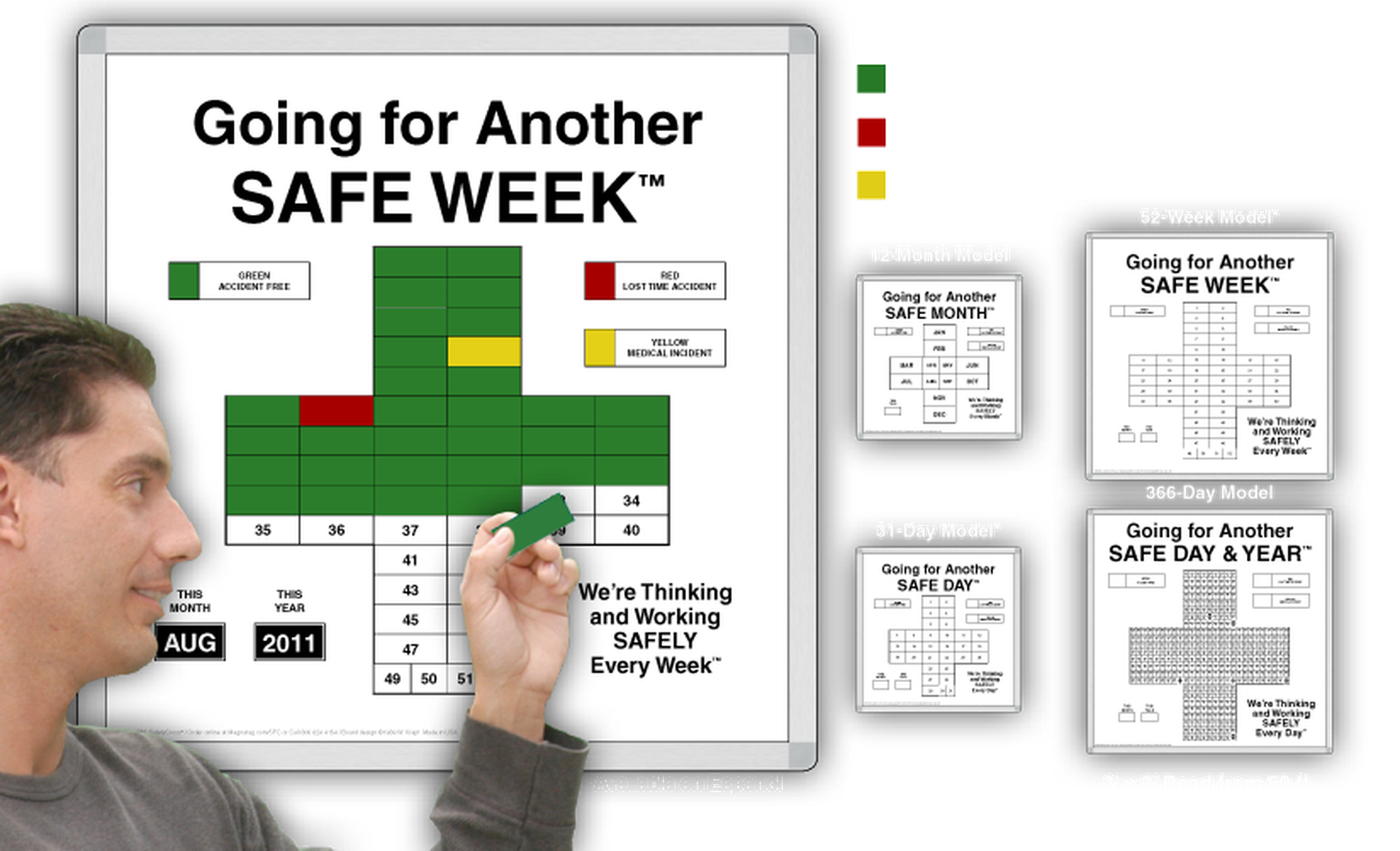Everybody takes pride in setting a record; so posting safety records helps direct the team to ensuring they beat prior safety records. As employees see that the company is close to setting or matching previous safety records, they may be motivated to take extra care to ensure that they exceed the previously set record for maximum days between safety incidents. When workers put the day's magnet on themselves they feel pride in building a green accident-free year. As this task is delegated, your safety goals will be embraced by your departments and employees. They also alert workers to any pattern of body-part injuries that may not otherwise be apparent, which with proper discussion can often trigger early preventive safety fix-it actions.