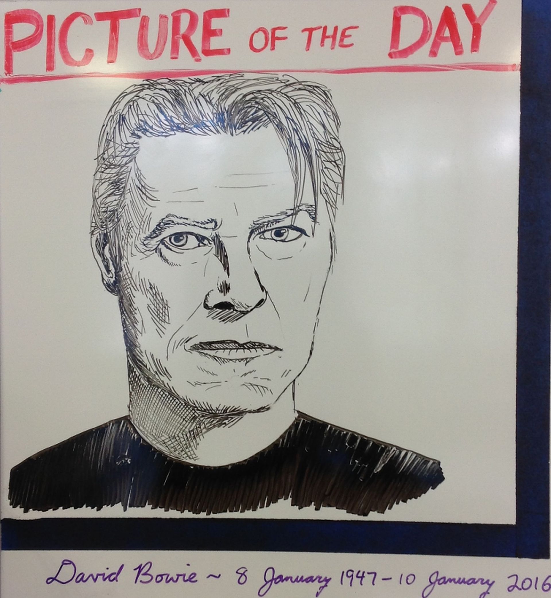 A: Well, it was my first day of teaching and I was attempting to get my classroom situated for my first day of class. I just got finished segmenting the whiteboard into different portions and I realized I had an extra space I did not account for. Given that I had a few extra minutes before students would begin showing up, I just spontaneously began drawing and it evolved from there. My drawings only take on average anywhere from five to ten minutes, with the more elaborate portraits taking upwards of twenty. I had the spare time so I figured “why not?”