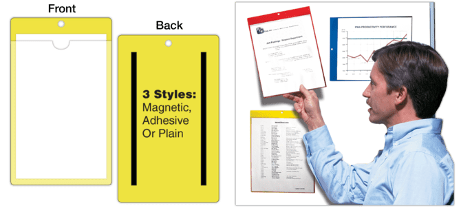 Display notices, sheets, job orders, specifications, safety instructions, etc. with these clear vinyl magnetic, adhesive or plain document display jackets. Magnetically clamp them to steel surfaces, adhere them to any clean, dry, smooth surface or peg-hang them. Front side is transparent vinyl and back is opaque white, red, blue, yellow, tan, green or transparent.