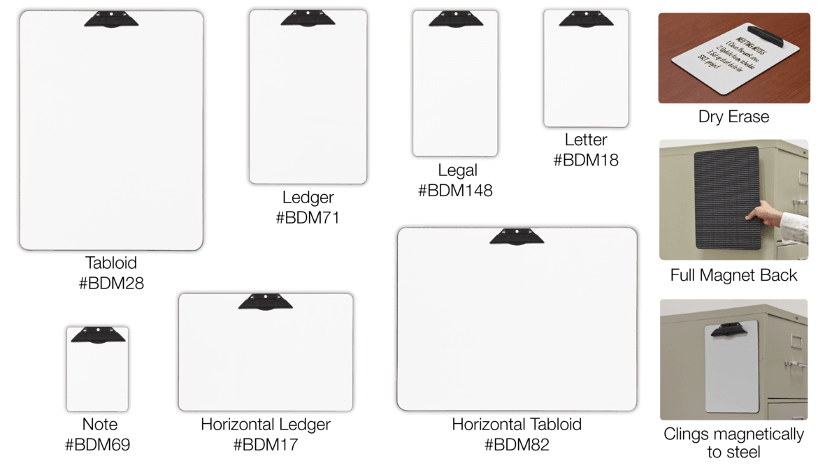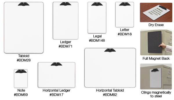 Dry-Erase whiteboard surface clipboard has a strong magnetic back to keep papers handy on any flat steel surface: doors, desks, walls, files, etc. (except some grades of stainless steel). Write on the clipboard face with dry-erase or damp-erase pens and markers. 7 sizes available.