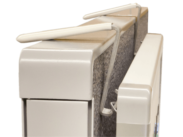 The unique, dislodgement-resistant cubical whiteboard hanger design lets the board pivot against partition walls, hanging straight. They include white padded tops for added grip strength and scratch prevention.