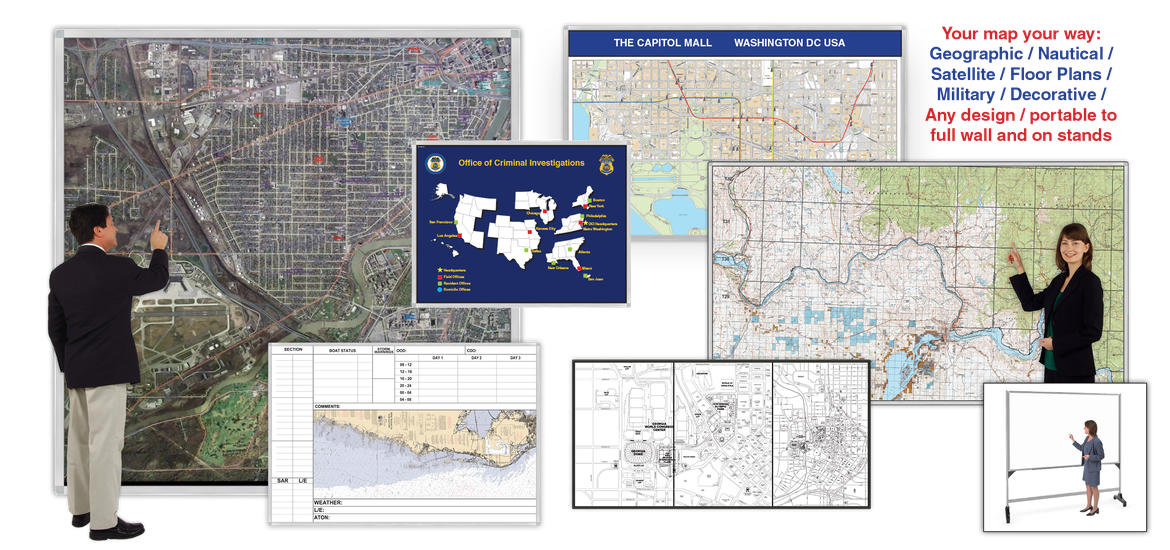 Order MagnaMaps® the way you want them: handsome, dry-erase steel whiteboard heat-fused printed with your customized digital map (or any map obtainable for reproduction), into our MagnaLux® porcelain-like steel whiteboard surface. We print all kinds of maps, floor plans and schematics from open outline to exquisitely detailed full color maps and digital images on single framed steel whiteboard panels up to 4x12' and larger sizes in matched registered sections with just a thin formed (almost invisible) flat seam between panels.