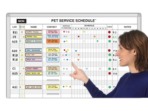See the overall details of your daily animal training program schedule. It shows each dog's color-coded scheduled and completed sessions with its handler and rating. You can order it with optional built-in T-cards for each animal in 10 colors for the animal's training and ID record. One glance at this board gives you a full overview of your dog training program in detail.It's fast and easy to use: Turn over the 2-sided red-green magnet symbols to show scheduled (red) and completed (green) sessions and magnet signals in another 10 colors visibly alert you to specific details of each animal's training progress, situation and condition. Kits include everything needed to operate it.