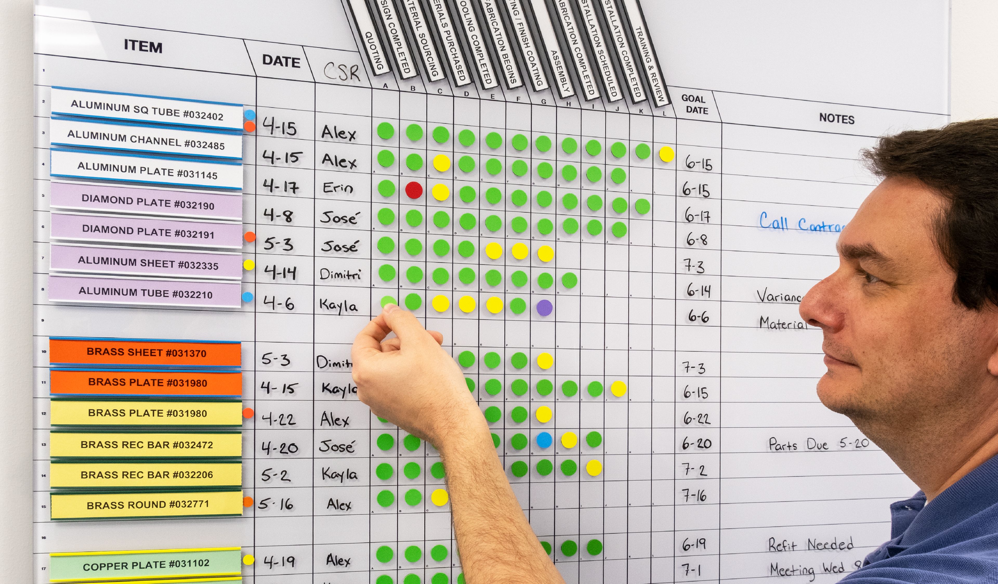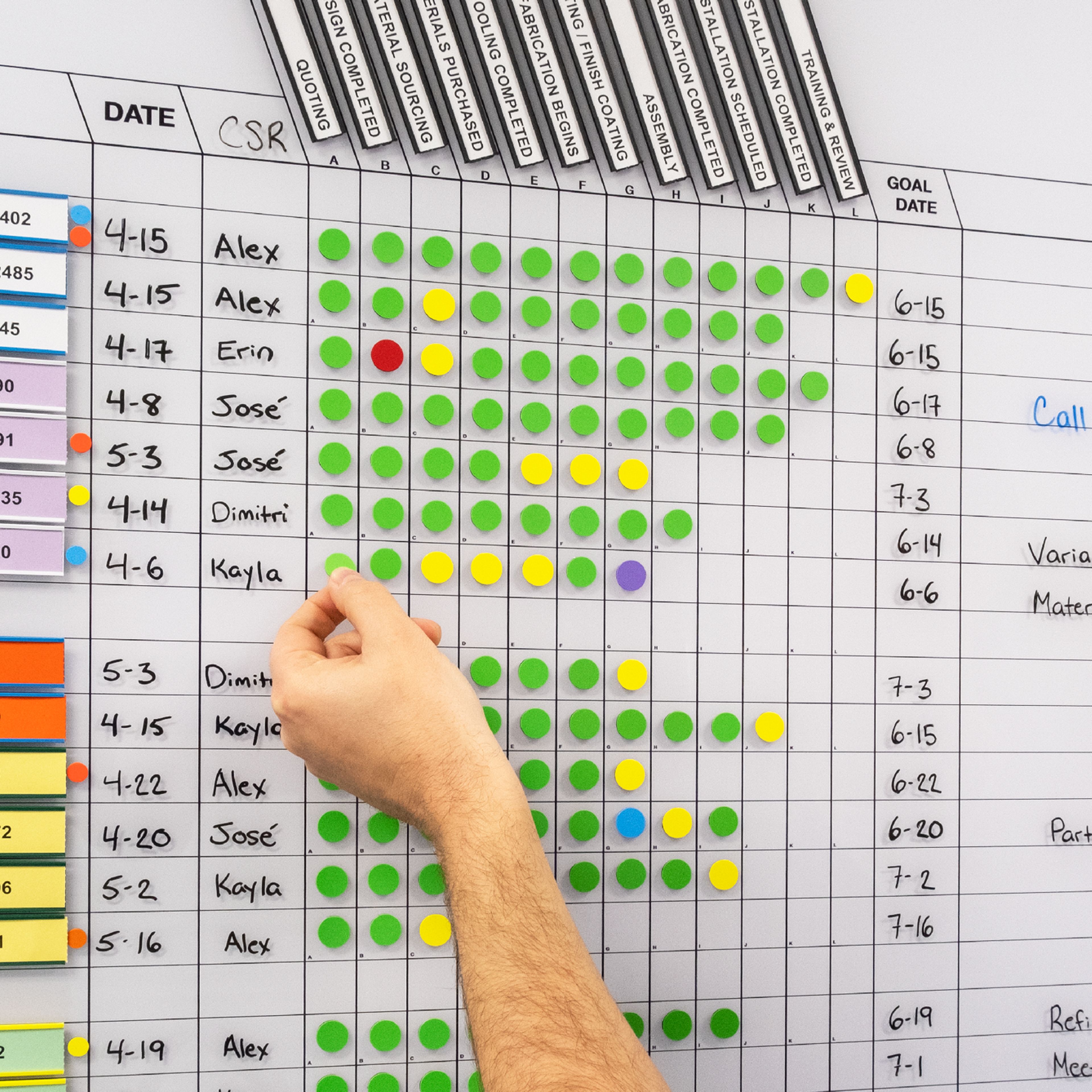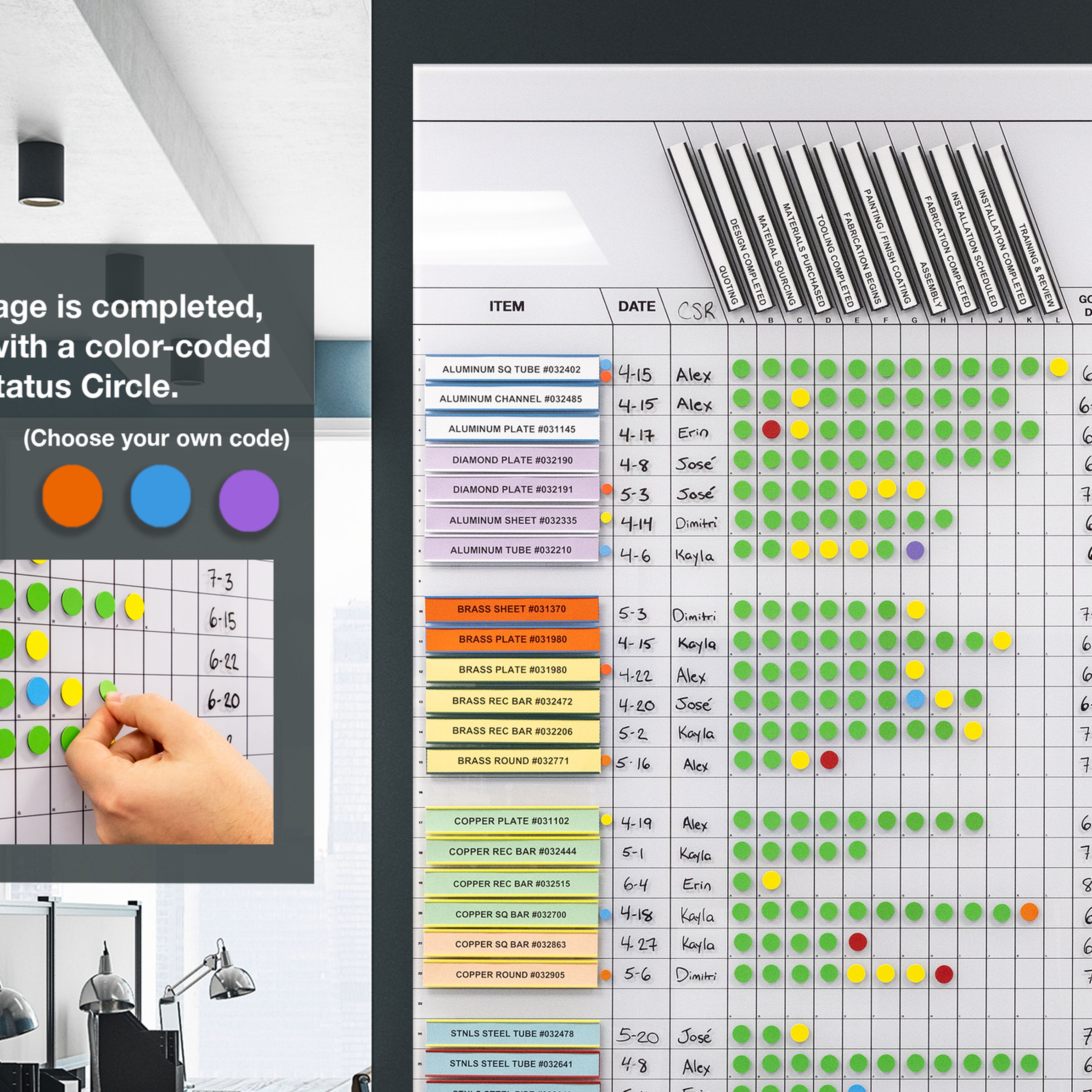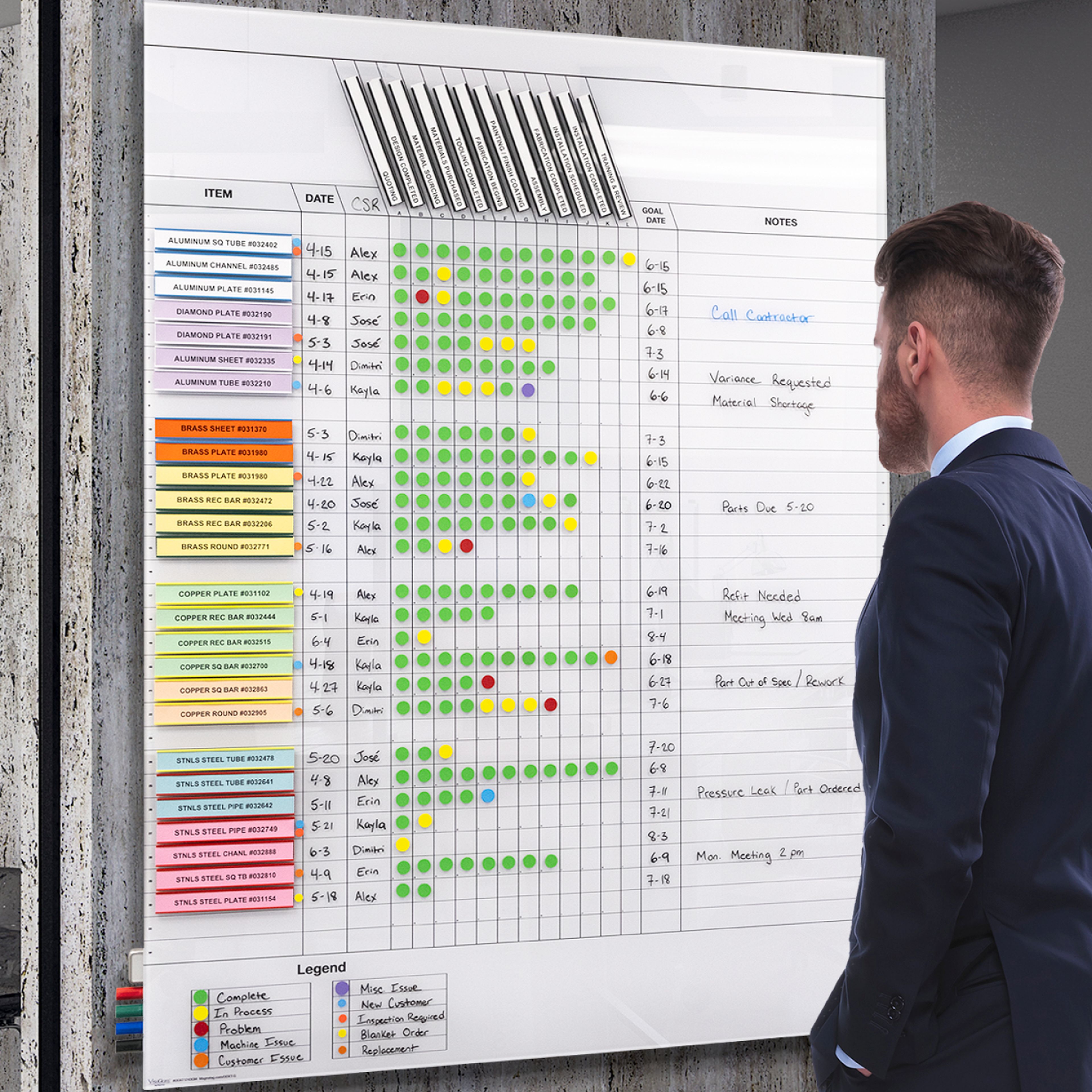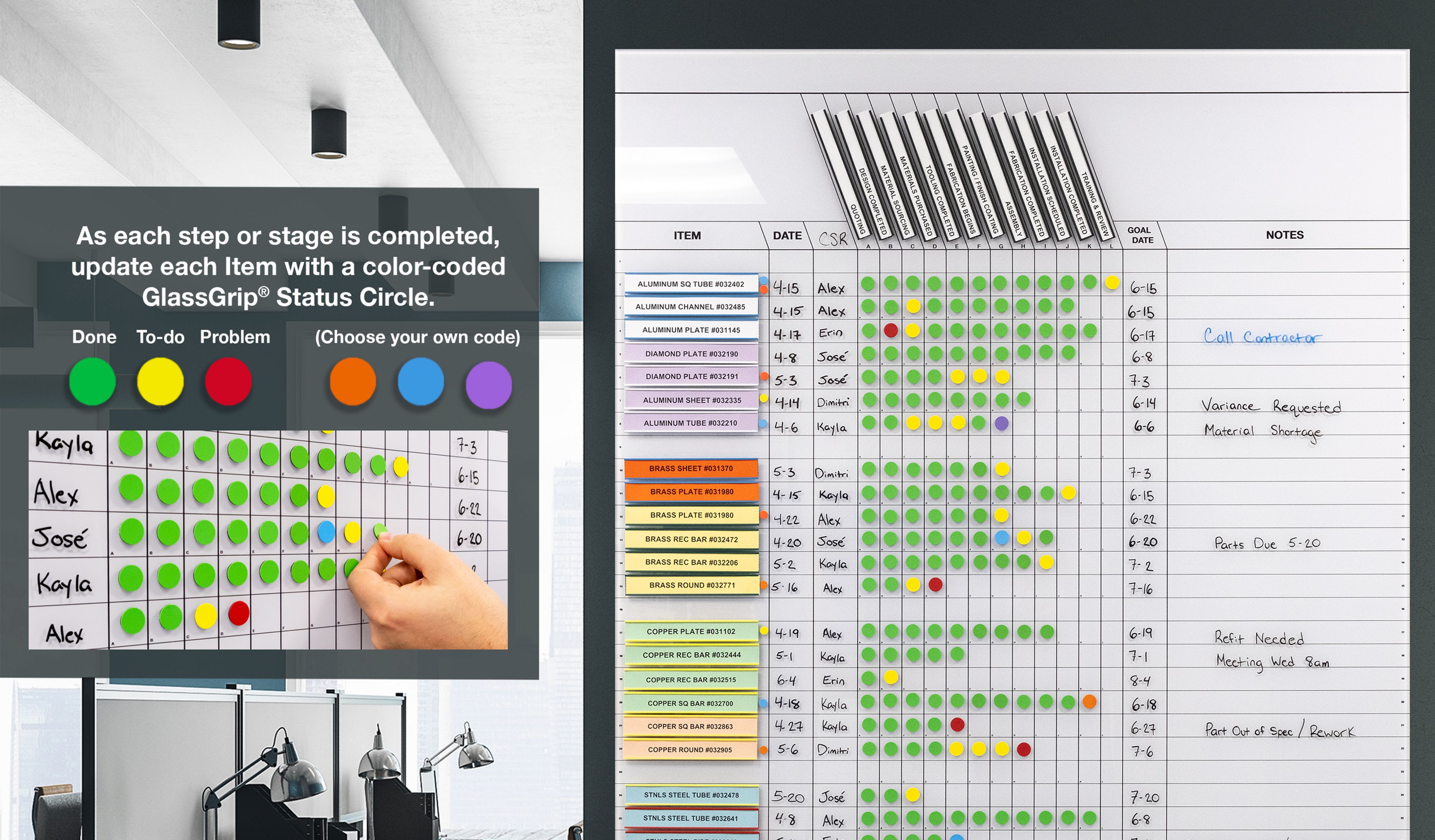 One glance at the green, yellow and red status symbols replaces countless phone calls and emails by showing everyone involved what’s done, what to do, when to do it and who needs to do it! Our customers tell us their StepTrackers® are the place where planning, scheduling, organizing and motivation meet! They combine the superior dry-erase properties of our printed glass whiteboards with the utility of our unique GlassGrip® accessories.