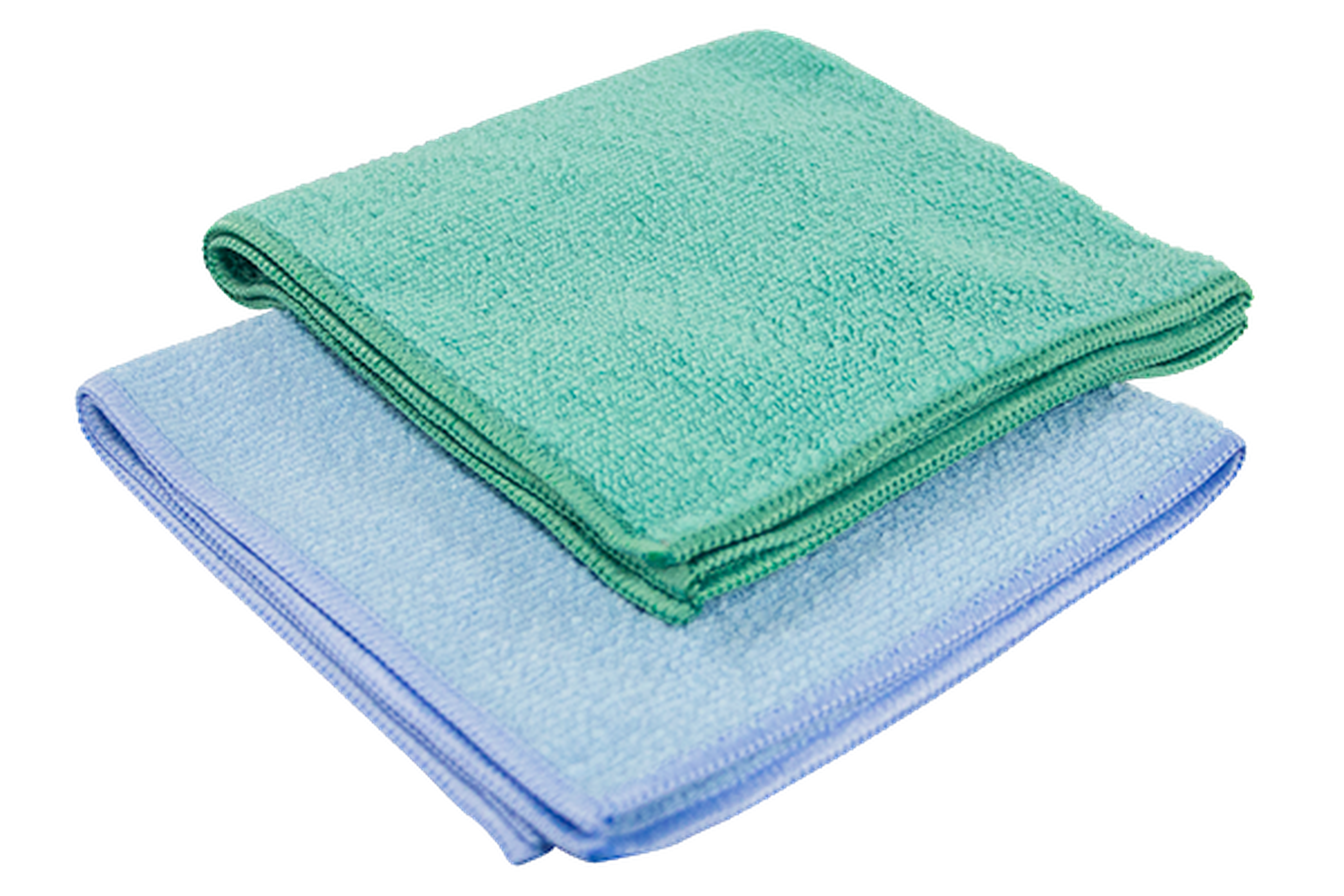 Package of two 12”x12” microfiber towels, green/blue, to clean and maintain glass whiteboards.