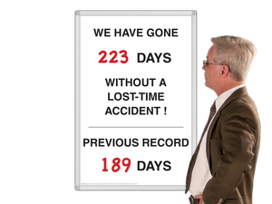 © Copyright Notice: The board and product designs, images, photographs, text and trademarks depicted on this page (and any other pages on this website) are protected under the copyright laws of the USA. All rights reserved.People focus more on working safely... We've been very happy with our HurtSpot safety board since we purchased it early last year to keep track of our recordable injuries. Since it is kept in our main hallway, all of the workers pass by it on their way in and out of the building. It definitely causes people to focus more on working safely. We find that the system works best when we update it on a daily basis. Whenever the board is updated to reflect an injury, you always see passerbyers stopping to read the informational T-cards. These are used to explain what happened and what we can do to prevent against this sort of accident in the future.