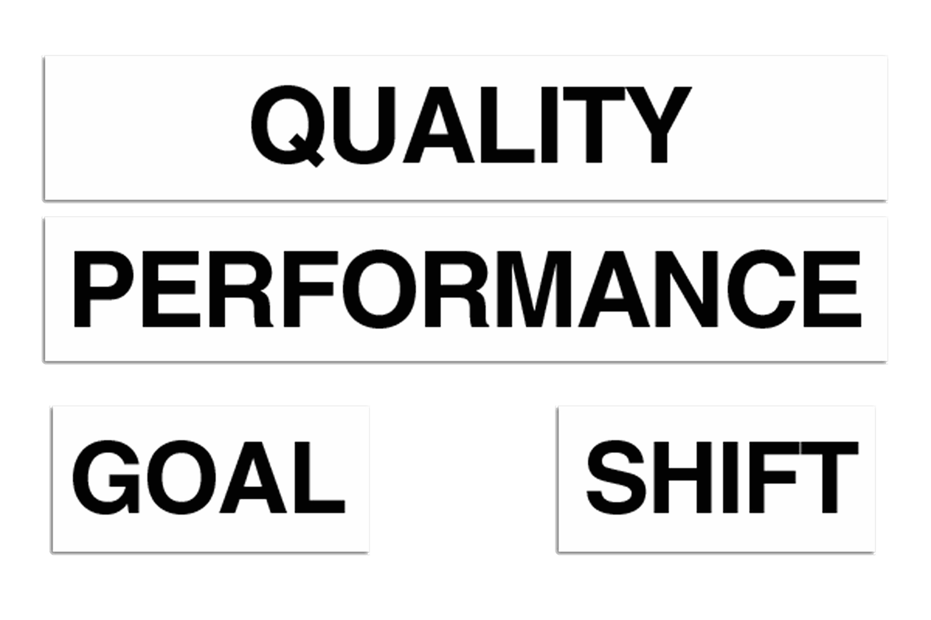 set of printed Performance Action Title card inserts, black on white, 1-3/8" x 8" (Quality, Scrap, F.P.Y., W.I.P., Prod. Eff., Shift Notes, Dept. Notes), Master title printed card inserts, black on white, 1-3/8" x 3" (Shift) and 1-3/8" x 8" (Performance).