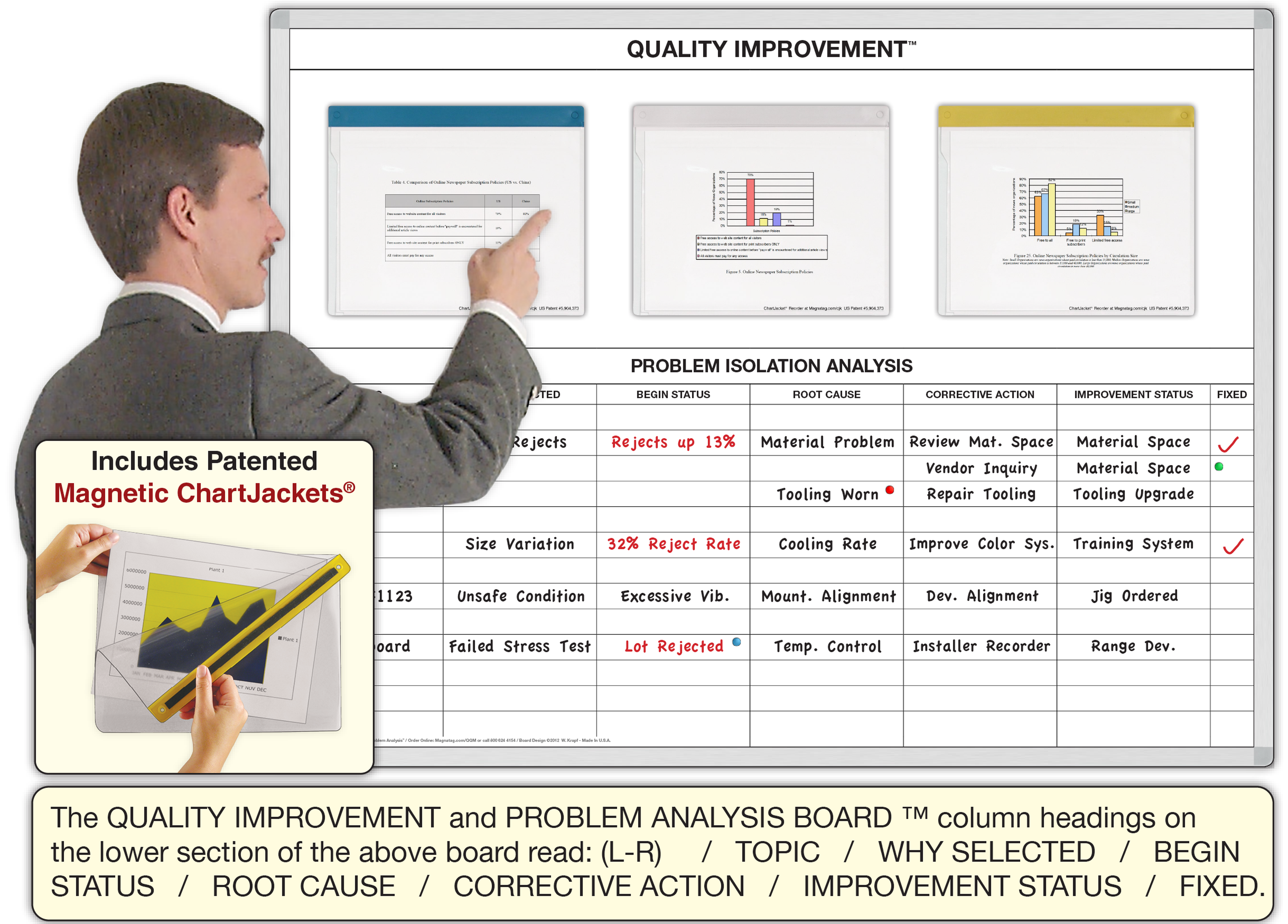 For real continuous quality assurance, display charts with details and points of comparison using these magnetic ChartJackets®. Post the board prominently at the work center. It documents problems, corrective action and quality improvement projects for all to see. Use the magnetic ChartJackets® to display your quality performance history on the top half of the board. Then post daily or ongoing problems on the lower portion. Encourage team members to solve problems by writing corrective actions directly on the board. It spotlights problems, gives recognition to problem-solvers and when the problems are corrected, turns it into a source of team pride.