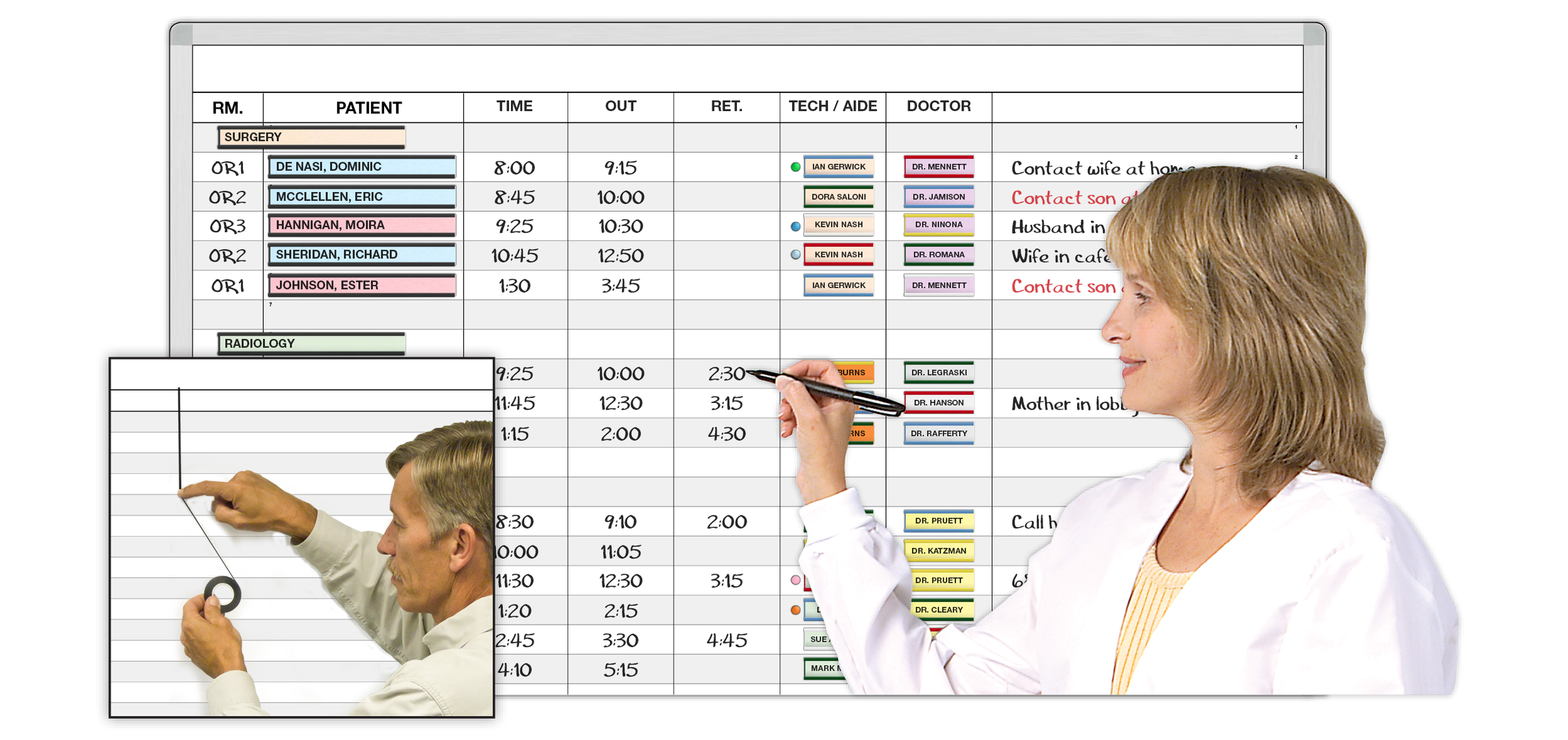Design the board yourself the way you want it. Horizontal lines and the first two column headings are printed with RM and PATIENT. Subdivide the remaining area into columns with the line tapes and press-on die-cut letters and numbers for column headings. If your needs change down the road, you can remove the taped lines and the press-on plastic lettering to prepare the board for a new design.