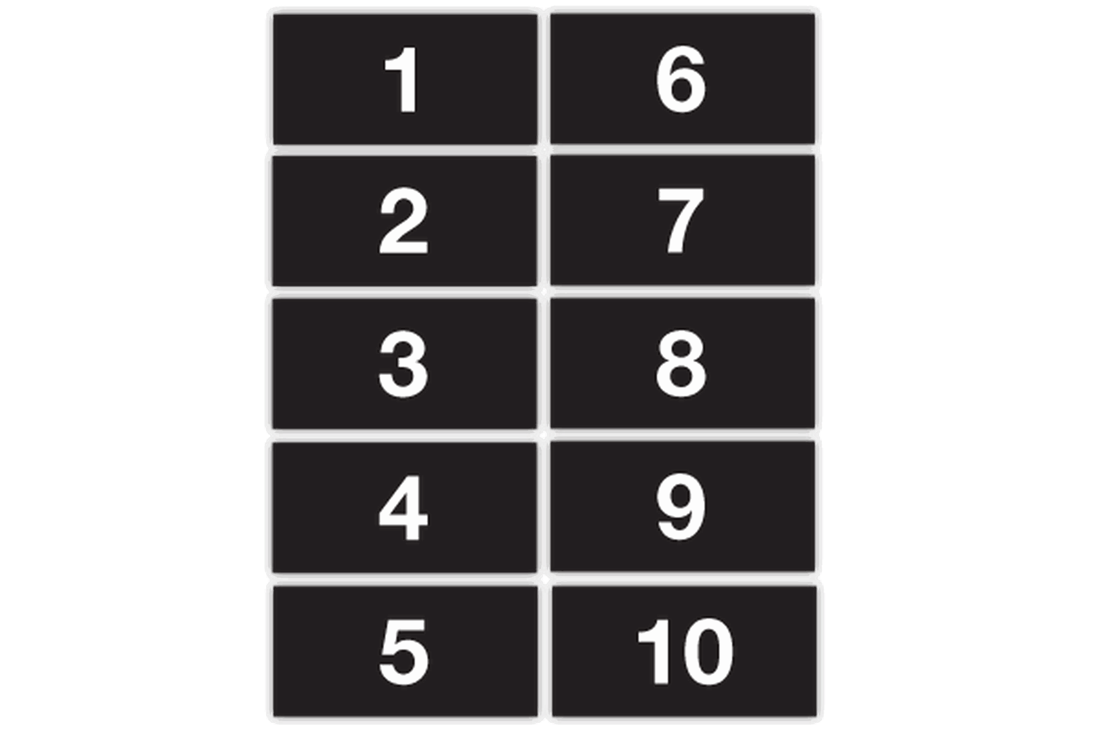 Set(s) of 125 press-on 3/4" vinyl die-cut black numbers (removable, not reusable) for master board title.