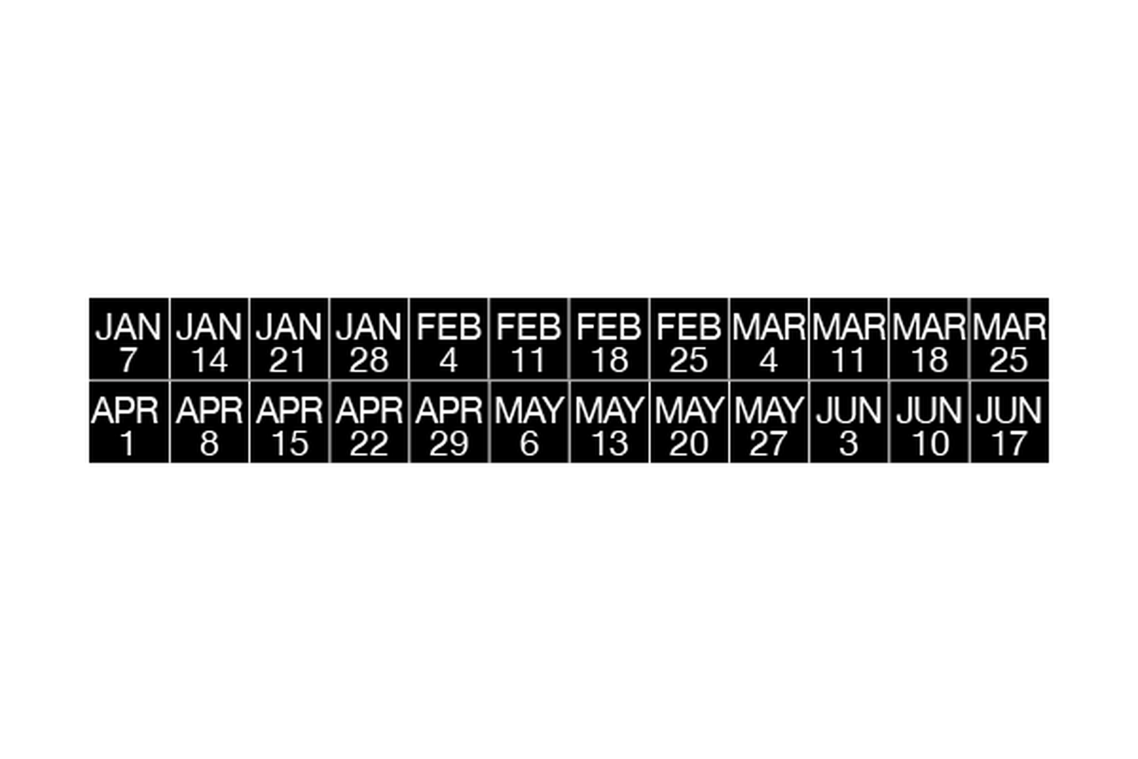 Three year set(s) of 1/2" x 26" card inserts printed with weekly dates (Saturdays) on 1/2" horizontal scale, white on black.