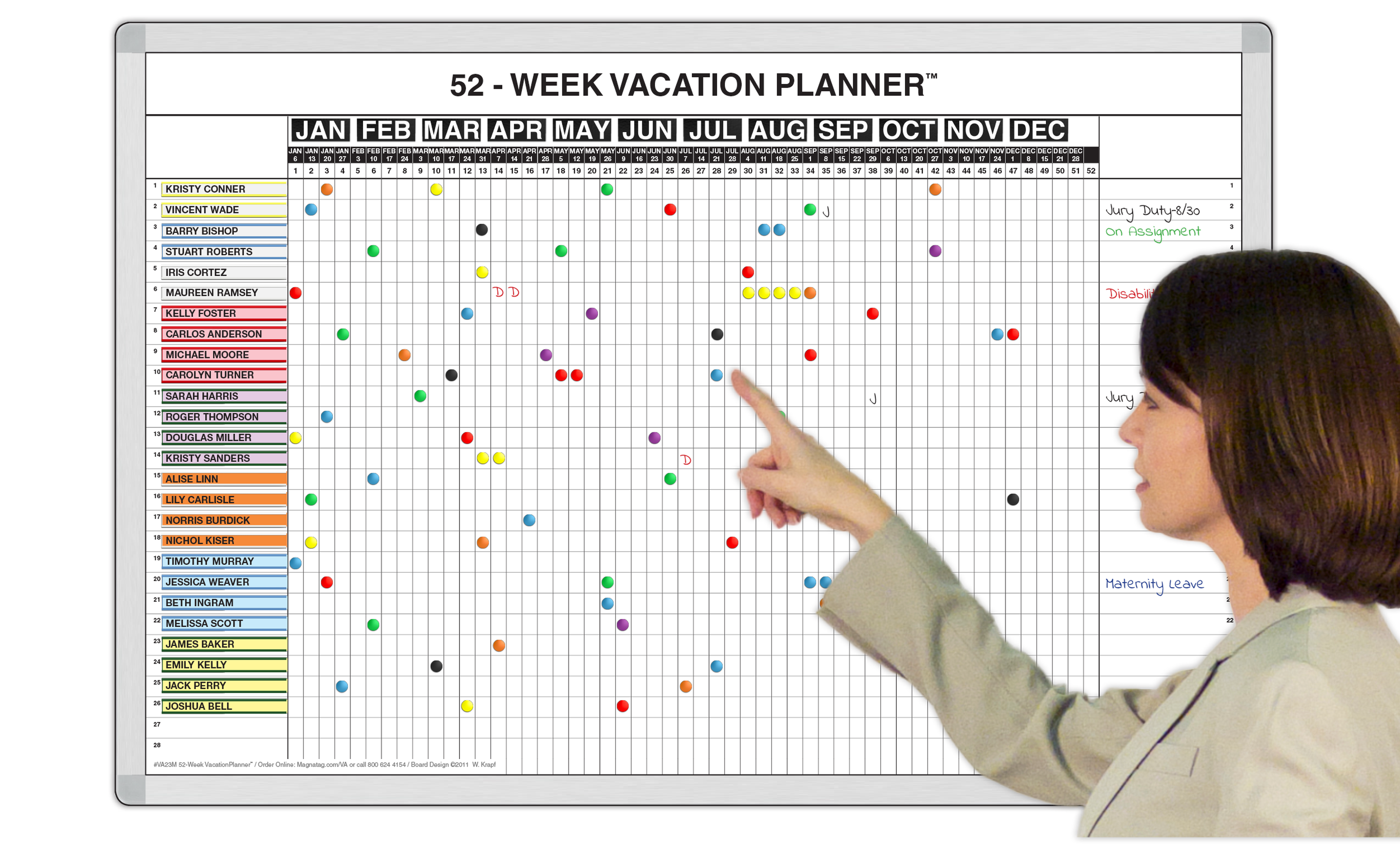 Keeping fully staffed enough to get your work done is fast and easy with these magnetic 52-week people time planners. List names down the left side with magnetic cardholders and use the 7 magnet symbol colors to show vacation request choices, type of time-off, planned or scheduled. Write on the dry-erase steel whiteboard too in 4 colors.
