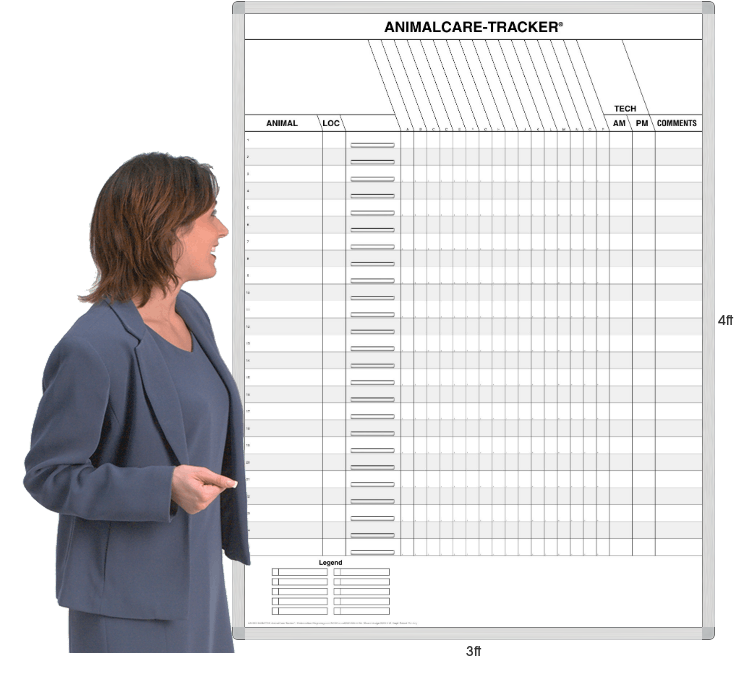 4'h x 3'w BoldLyne® framed MagnaLux® porcelain-like steel magnetic whiteboard heat-fused printed for this system with a built-in T-card file slot for each animal row