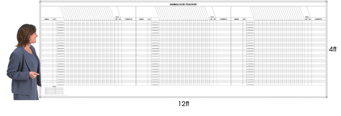 See each animal showing care-tasks to-do, done and problem or delay. 7 Sizes for 6 to 48 care tasks x 16 to 150 animals.