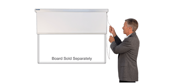 Quickly lower or raise the opaque white screen to any position with the pulley chain. No springs. Self-contained and portable in a handsome satin aluminum case, it mounts easily to the top of your BoldLyne® framed Magnatag® whiteboard with included mounting clips. It can also be attached to the wall above the board or anything else you wish to privatize and it will hold at any point for partial coverage.