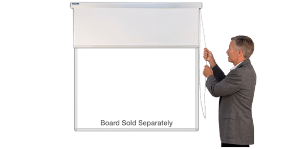 Quickly lower or raise the opaque white screen to any position with the pulley chain. No springs. Self-contained and portable in a handsome satin aluminum case, it mounts easily to the top of your BoldLyne® framed Magnatag® whiteboard with included mounting clips. It can also be attached to the wall above the board or anything else you wish to privatize and it will hold at any point for partial coverage.