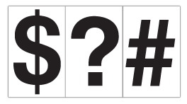 Full Sets - GlassGrip® Numbers, Letters, Symbols & Punctuation 272 characters and 24 spacer: 108 letters, 104 numbers, 60 symbols & punctuationLetter Sets - GlassGrip®: 108 Letters: 9 each E, 6 each AHILNORST, 3 each BCDFGJKMPUVWY, 2 each QXZNumber Sets - GlassGrip®: 104 Numbers: Sixteen each 0 1, Twelve each 2 5, Eight each 3 4 6 7 8 9Symbol & Punctuation Sets - GlassGrip®: 60 Symbols and 24 spacer magnets: 20 each . 9 each, 4 each / 3 each ; : 2 each ! * = ? $ ( ) - " 1 each & # %