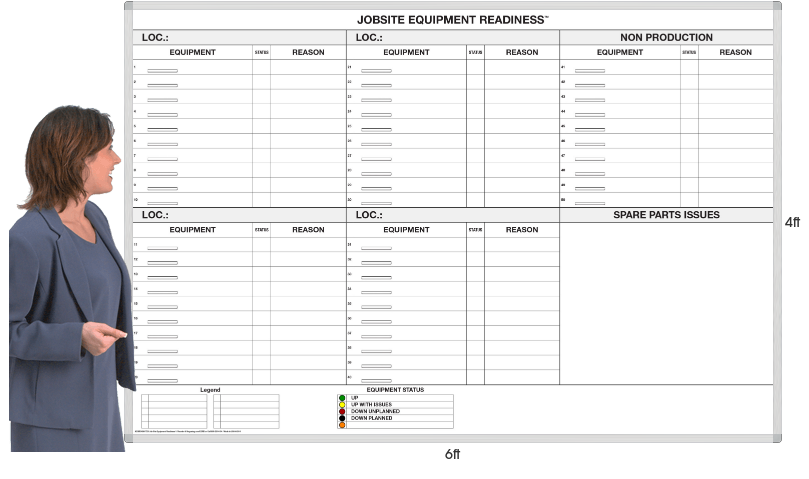 Each equipment item gets the attention it needs on-time and in-time with this board. Magnetic symbol colors show where to focus your attention to insure smooth production flow. Just move the magnets to make changes. It's as flexible as your imagination. Optional built-in visible 5x3" T-cards let you keep equipment history details at your fingertips.
