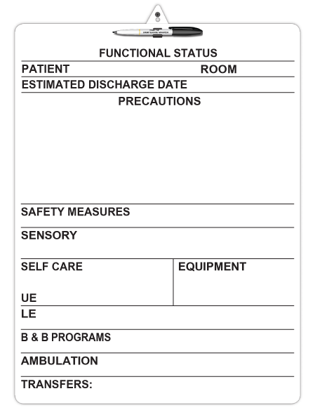 Hang them on the wall, door or bed with the key-hole slot hanger that swivels flat behind the board when used portable. Lift it off the wall to write on it. It has a built-in pen clip and includes a fine point, dry-erase black pen. Carry it to patient bedside or anywhere you need to record or refer to the data, then rehang it when done. Top quality, fast delivery and low prices in quantity.