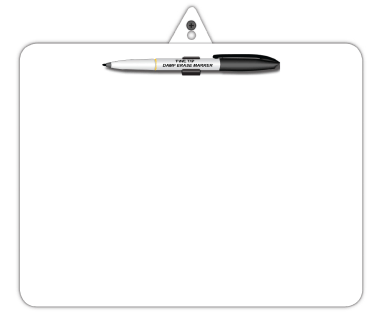 Hang them on the wall, door, or any vertical surface, etc. with the key-hole slot hanger which swivels flat behind the board when used portable. Lift it off the wall to write on it. It has a built-in pen clip and comes with a fine point, dry-erase black pen.