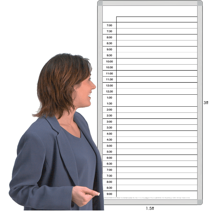 Ideal for any active working operation. Post any ongoing or scheduled activity to the hour around-the-clock, or to 30-minute slots for 12 hours. Use big 1x5" color-coded magnetic cardholders, card inserts (with CD/ROM card-keying template) and magnet status signals in 10 colors to quickly post and change repetitive tasks. Write fast notes with the dry-erase markers.