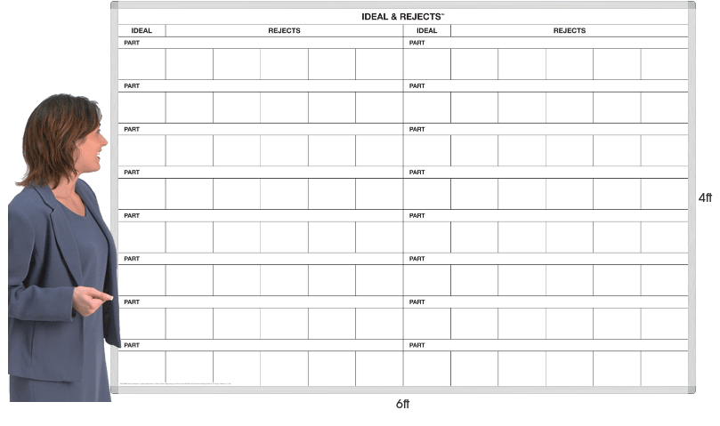 This essential production whiteboard will be referred to constantly by your machine and assembly operators with quality improvements immediate and continuing. As a quality assurance tool, it is a must wherever attention to parts integrity and tolerances is important.