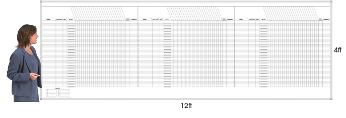 4x12' MagnaLux® steel framed whiteboard with built-in T-Card file slot for each row and heat-fused printed for this application
