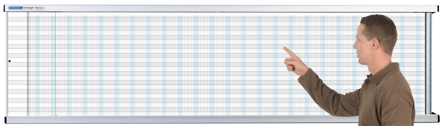 RotoGraph® perpetual timeline planner; the only schedule that never runs out of time and space. The transparent poly-film endless rolling timeline sleeve is grid-printed and turns with end rollers that guide it over a magnetic steel faceplate. Write on it with the damp-erase pens and show task-length with tapes, write-on lines or with the multicolored magnet strips with grid-matching guidelines you can scissor-cut to show exact task length. When you roll the sleeve, the magnets slide with it. Written or taped data can continue to wind behind the end rollers, but magnets hold only on the open viewing area.