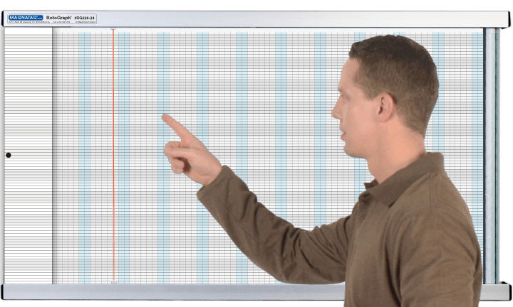 RotoGraph® perpetual timeline planner; the only schedule that never runs out of time and space. The transparent poly-film endless rolling timeline sleeve is grid-printed and turns with end rollers that guide it over a magnetic steel faceplate. Write on it with the damp-erase pens and show task-length with tapes, write-on lines or with the multicolored magnet strips with grid-matching guidelines you can scissor-cut to show exact task length. When you roll the sleeve, the magnets slide with it. Written or taped data can continue to wind behind the end rollers, but magnets hold only on the open viewing area.