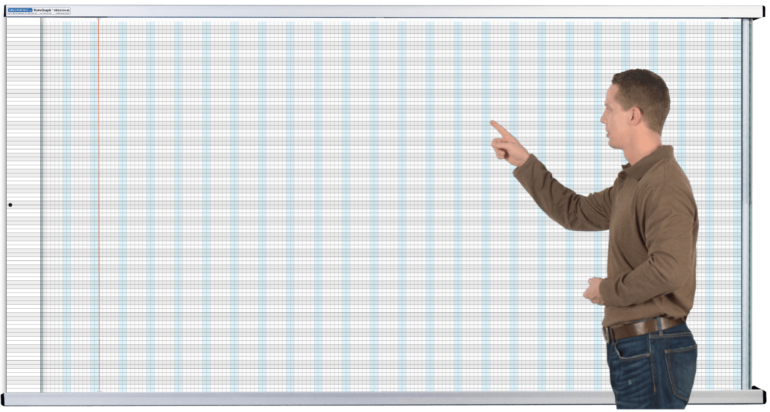 RotoGraph® perpetual timeline planner; the only schedule that never runs out of time and space. The transparent poly-film endless rolling timeline sleeve is grid-printed and turns with end rollers that guide it over a magnetic steel faceplate. Write on it with the damp-erase pens and show task-length with tapes, write-on lines or with the multicolored magnet strips with grid-matching guidelines you can scissor-cut to show exact task length. When you roll the sleeve, the magnets slide with it. Written or taped data can continue to wind behind the end rollers, but magnets hold only on the open viewing area.