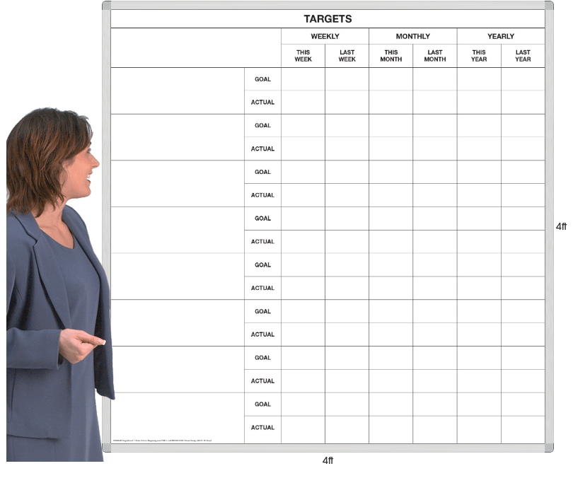4'h x 4'w porcelain-like framed steel whiteboard with 8 subject areas, & target vs. actual totals columns, heat-fused printed