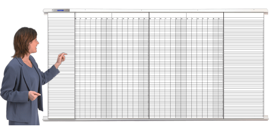 Your daily work plan against a left-to-right timeline. Day by day and line by line, this system delivers the big picture you can instantly update by moving magnets. Expandable to any length. 50" high, 1" or 1/2" rows, 4, 6 and 8 week models.