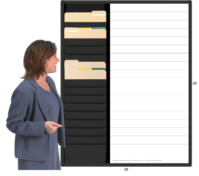 Tape vertical lines to make your own special project management columns. Includes die-cut press-on adhesive letter & number sets for your column headings and board titles. The visible FileView® rack mounts to either left or right of the white board. It holds a file folder of project management plans and specifications for each of 17 project rows. The write-on, magnetic steel whiteboard has 2.4"h heat-fused horizontal rows that register with the file pockets.