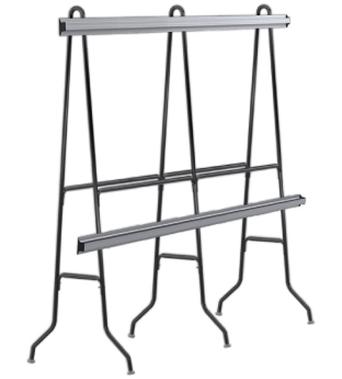 Display any number of our boards in multiple sizes. Sturdy aluminum and black-steel patented stands have 2-channel satin-aluminum SlideTracks™ for 1 or 2 tiers of boards on one or both sides, two sliding rows deep. The A-frame easel-mode "back-saver" design cuts bending to post them. Boards slide in the tracks, lift out and reposition in any sequence. The clamp-on tracks are height-adjustable and expandable with add-on tracks and base frame units. One row of boards slide over the other so you can conceal confidential ones in the rear track until slid out to view. Built for heavy-duty daily use.