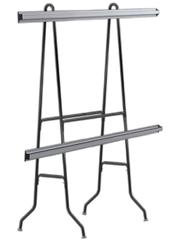 Display any number of our boards in multiple sizes. Sturdy aluminum and black-steel patented stands have 2-channel satin-aluminum SlideTracks™ for 1 or 2 tiers of boards on one or both sides, two sliding rows deep. The A-frame easel-mode "back-saver" design cuts bending to post them. Boards slide in the tracks, lift out and reposition in any sequence. The clamp-on tracks are height-adjustable and expandable with add-on tracks and base frame units. One row of boards slide over the other so you can conceal confidential ones in the rear track until slid out to view. Built for heavy-duty daily use.