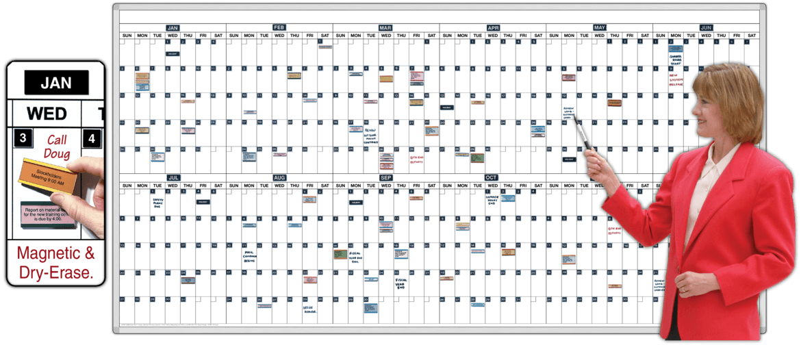 The familiar calendar format everyone knows. Quickly and efficiently plan, post, change and update your activities on this dry-erase, magnetic whiteboard calendar. Use magnetic cardholders and card inserts for 50 color-combination codes, and magnetic status signals in 10 colors. You can also write on the board with dry erase pens in 4 colors. No matter how detailed or intense your year schedule becomes, you can instantly locate the item by its color code. To make changes, just move the magnets.