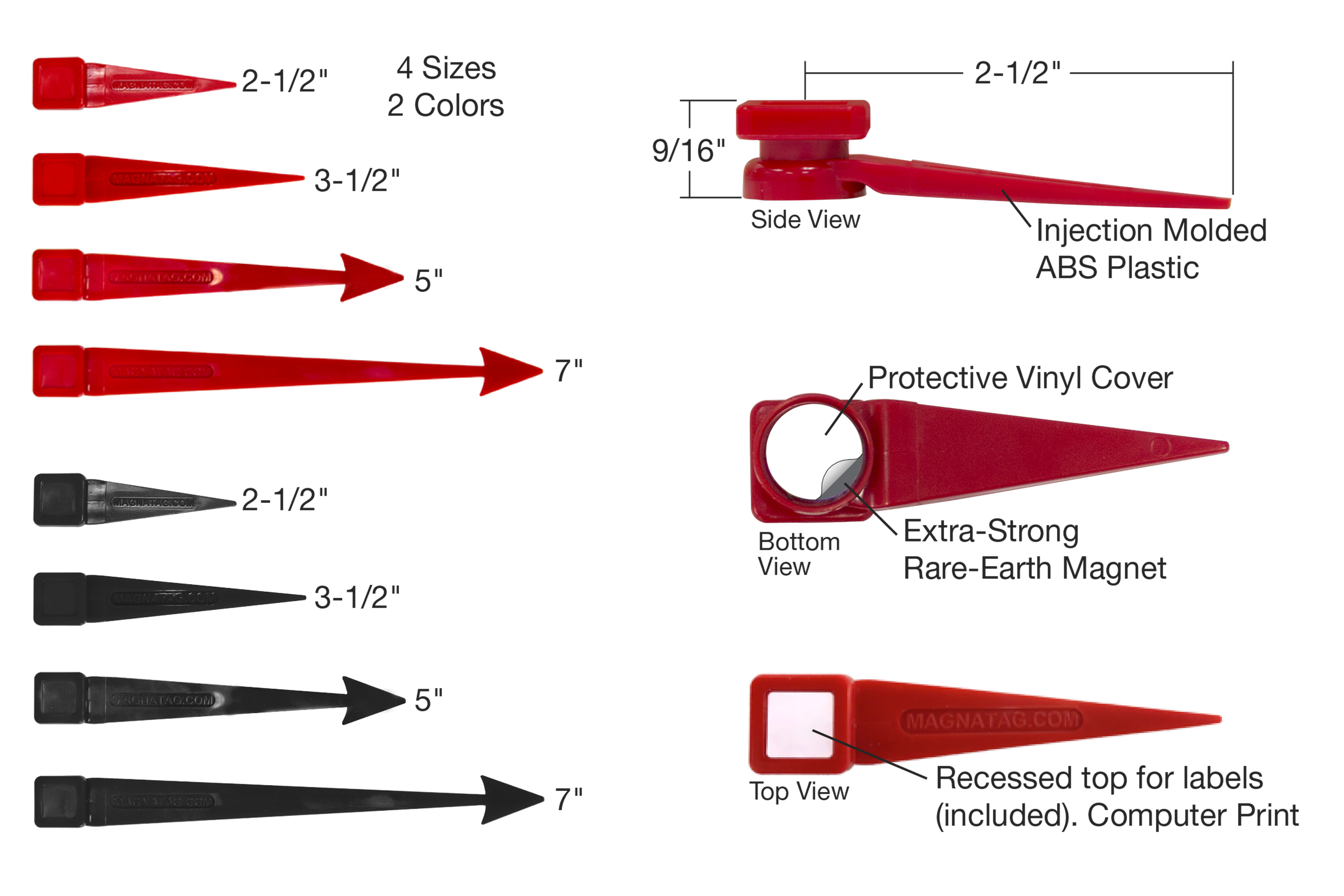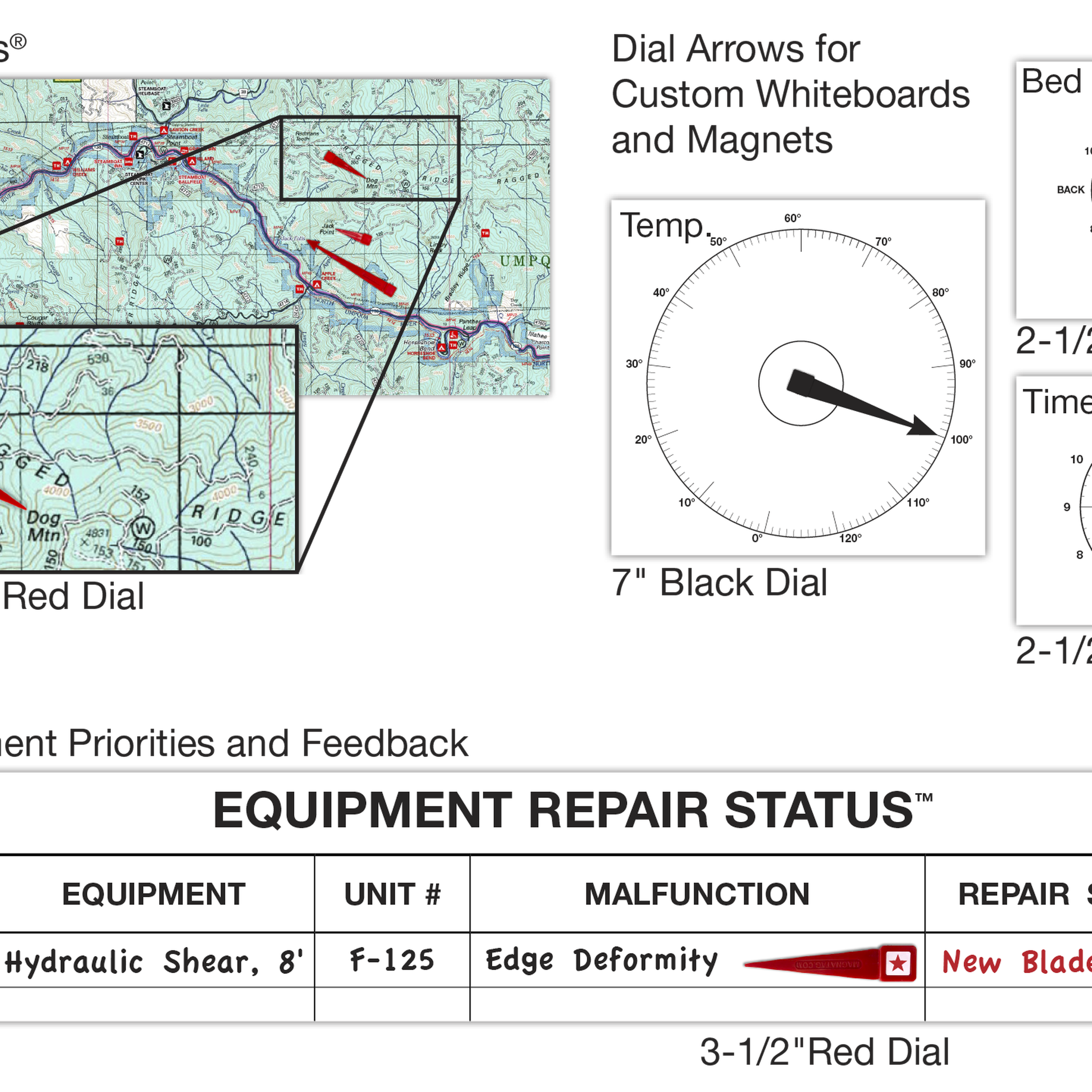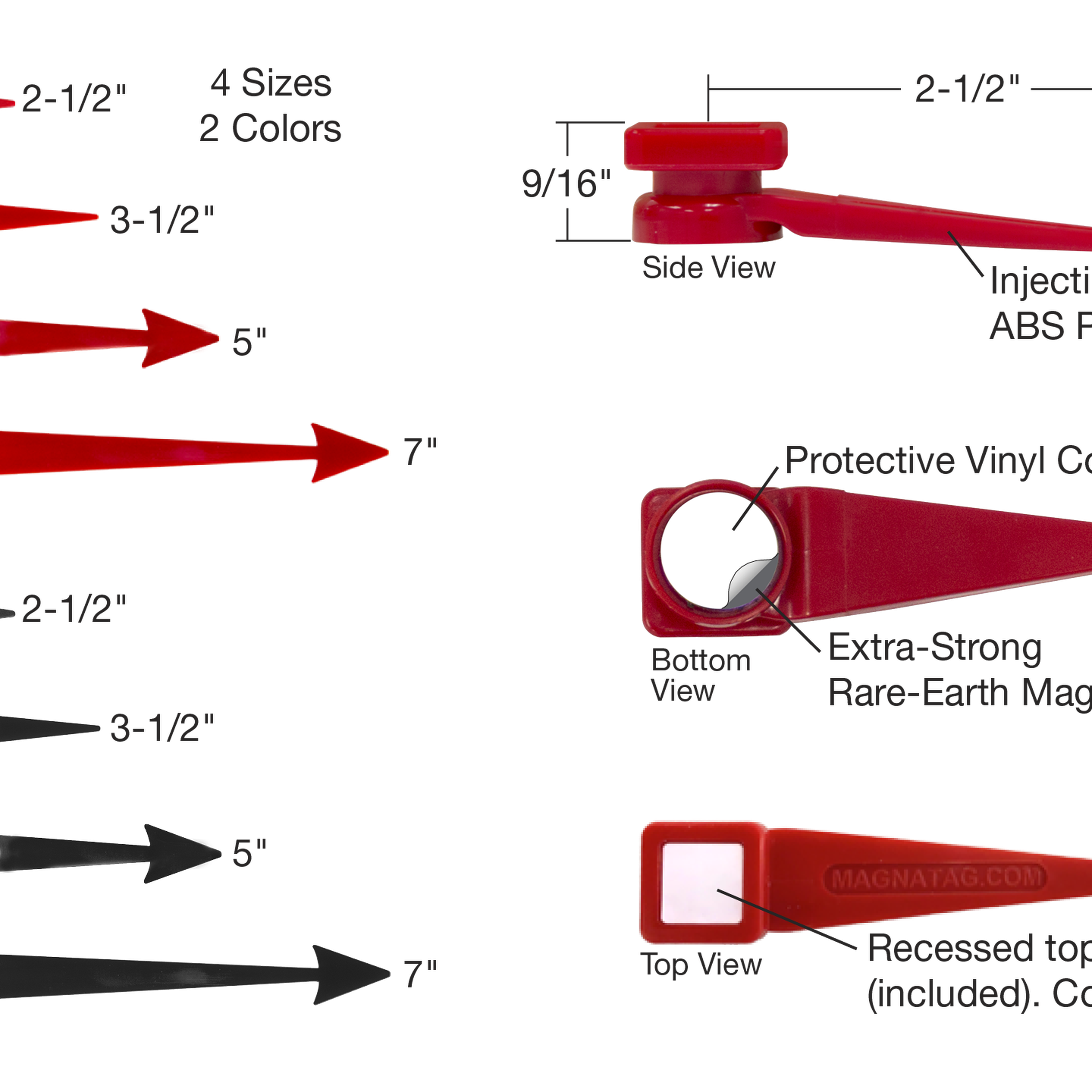 Extra-strong magnetic DialTack arrows point to your most important data, keeping your team focused and on task. Use them on MagnaMaps®, productivity or line item boards, calendars or as an attention-grabbing arrow on your custom-designed steel whiteboards or magnets. Made of ABS plastic with a rare-earth neodymium magnet to hold it into place. Available in 2 colors (red or black) and 4 sizes: 2-1/2", 3-1/2", 5" and 7".
