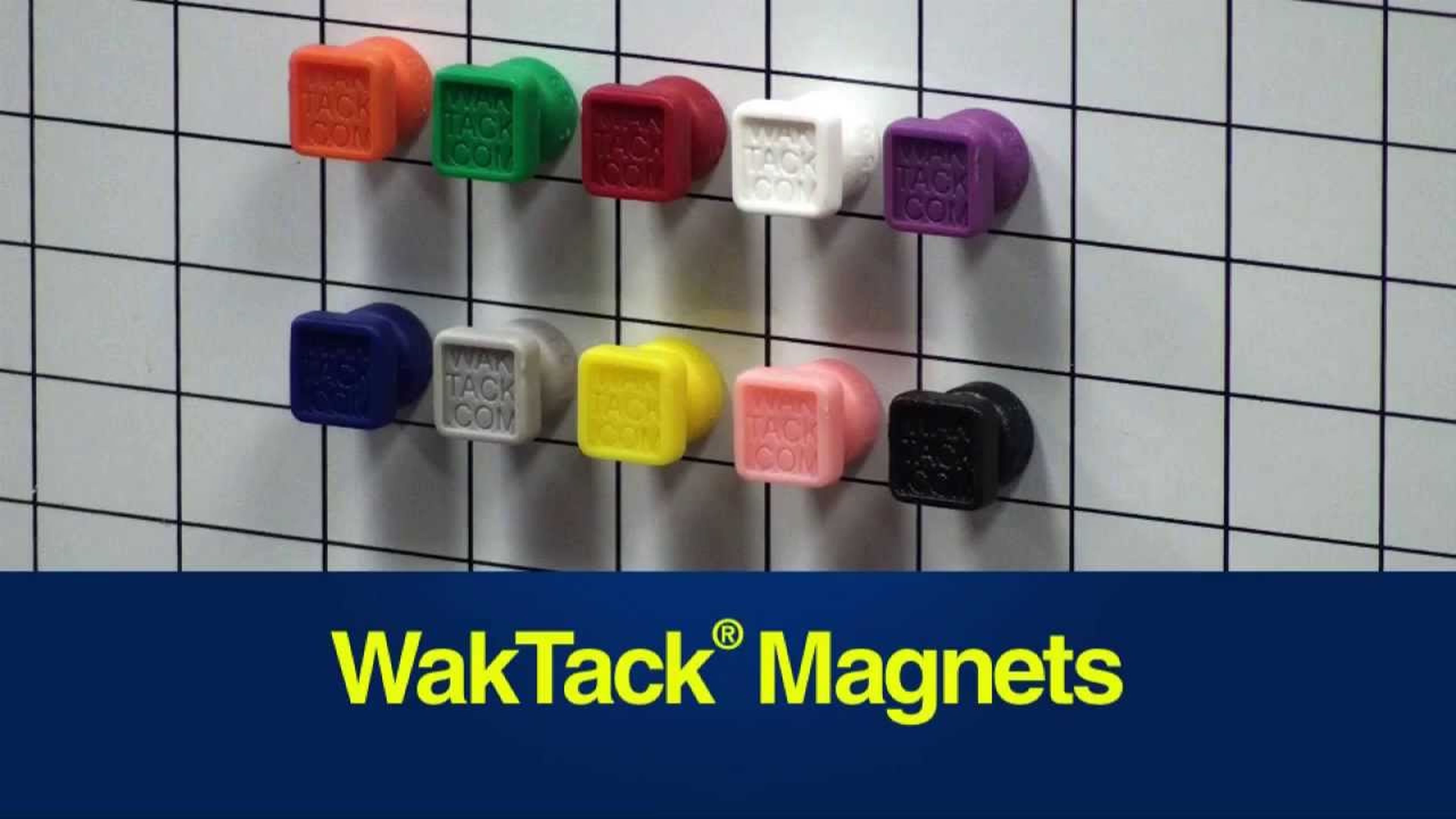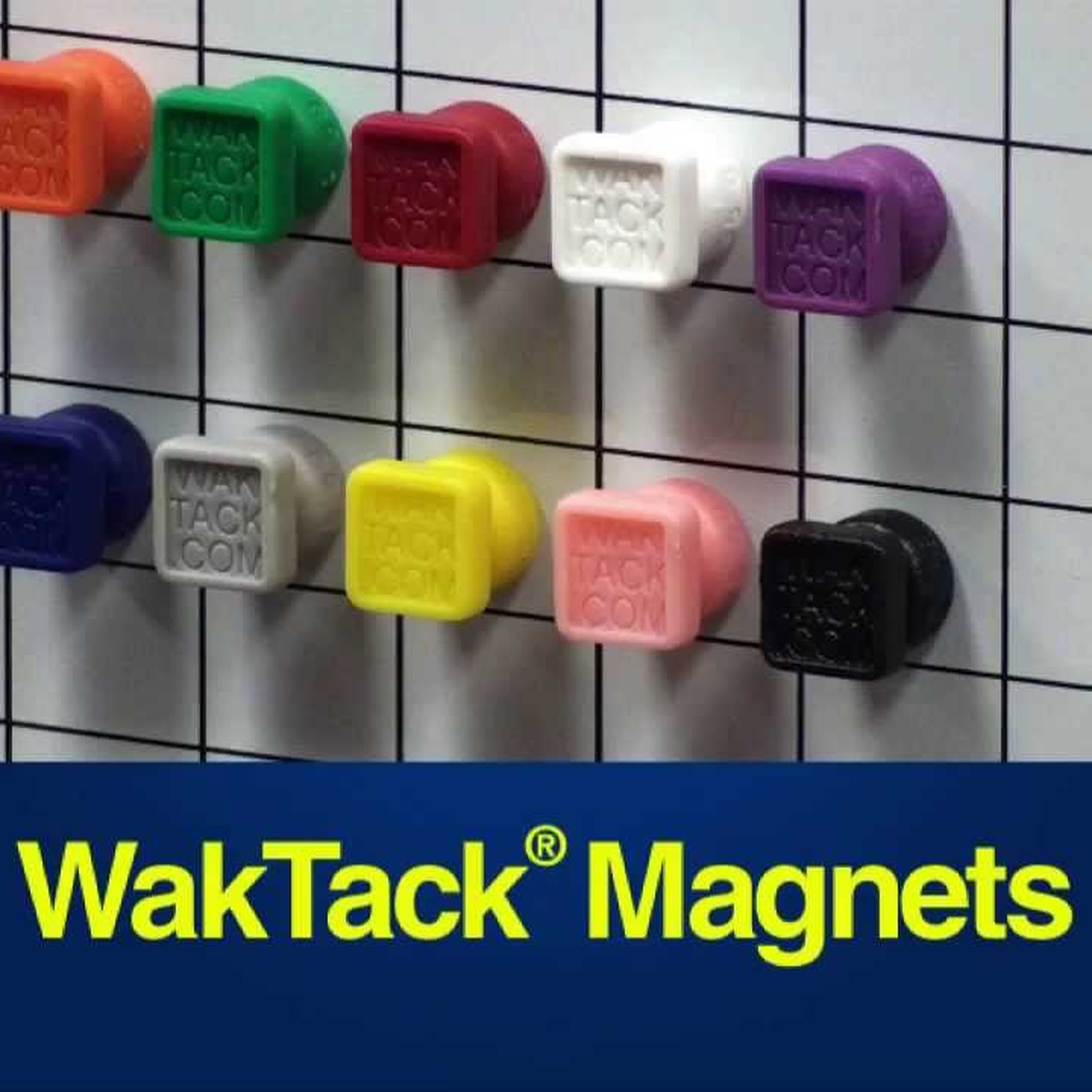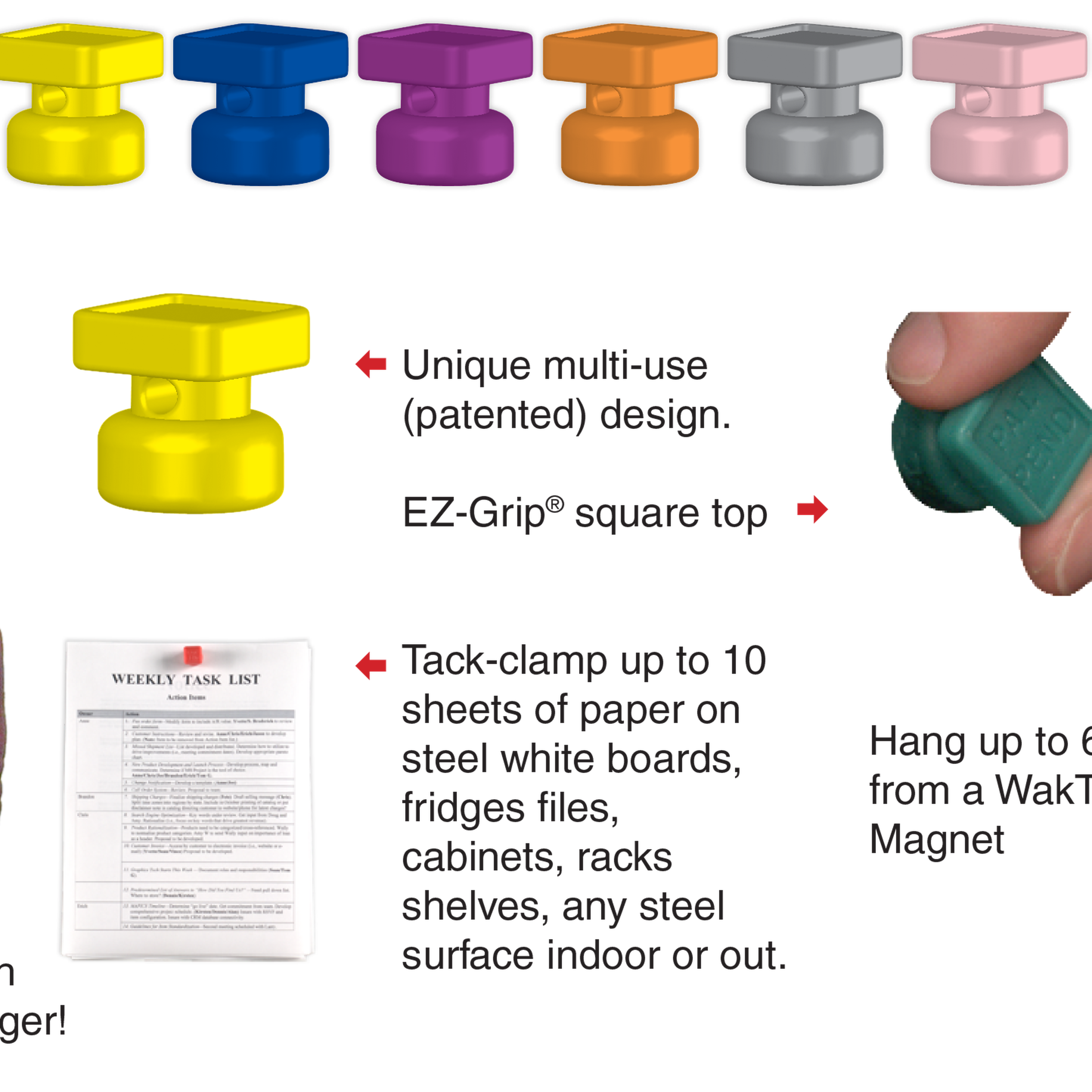 Powerful WakTack® magnets are a super-handy tool. They hold almost anything tight to steel and are fun to play with too. Made of nickel-plated neodymium, encased in our patented multi-purpose EZ-Grip® plastic holder, one of these extra-strong magnets holds up to 10 sheets of paper or 6 oz. of keys on your steel whiteboard. WakTacks® come in 10 colors for color coding multiple applications. WakTacks® work indoors and outdoors or anywhere you have a flat steel surface.