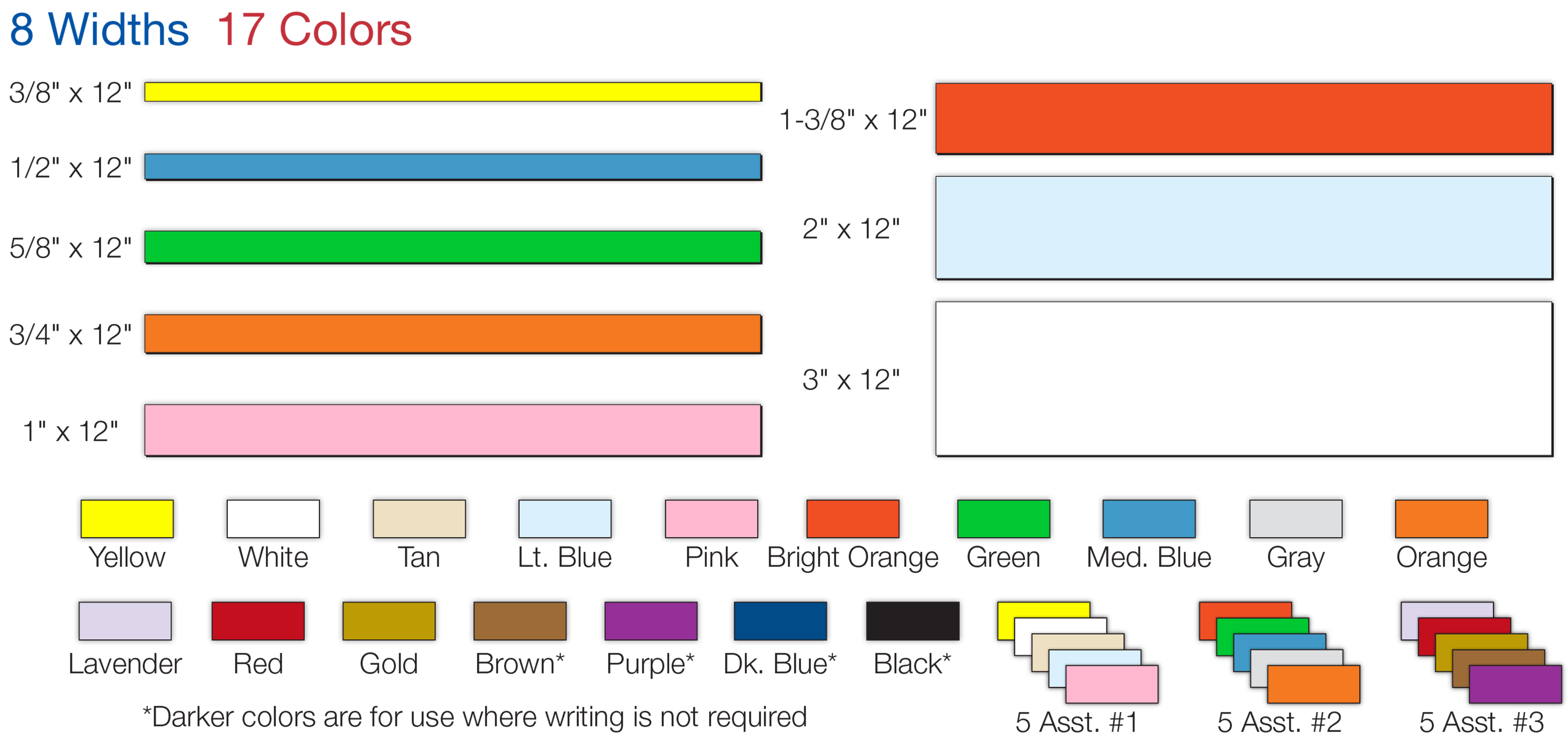 Surface: Use both damp and dry-erase pens and markers. Scissor-cut them to length. 8 widths x 17 colors