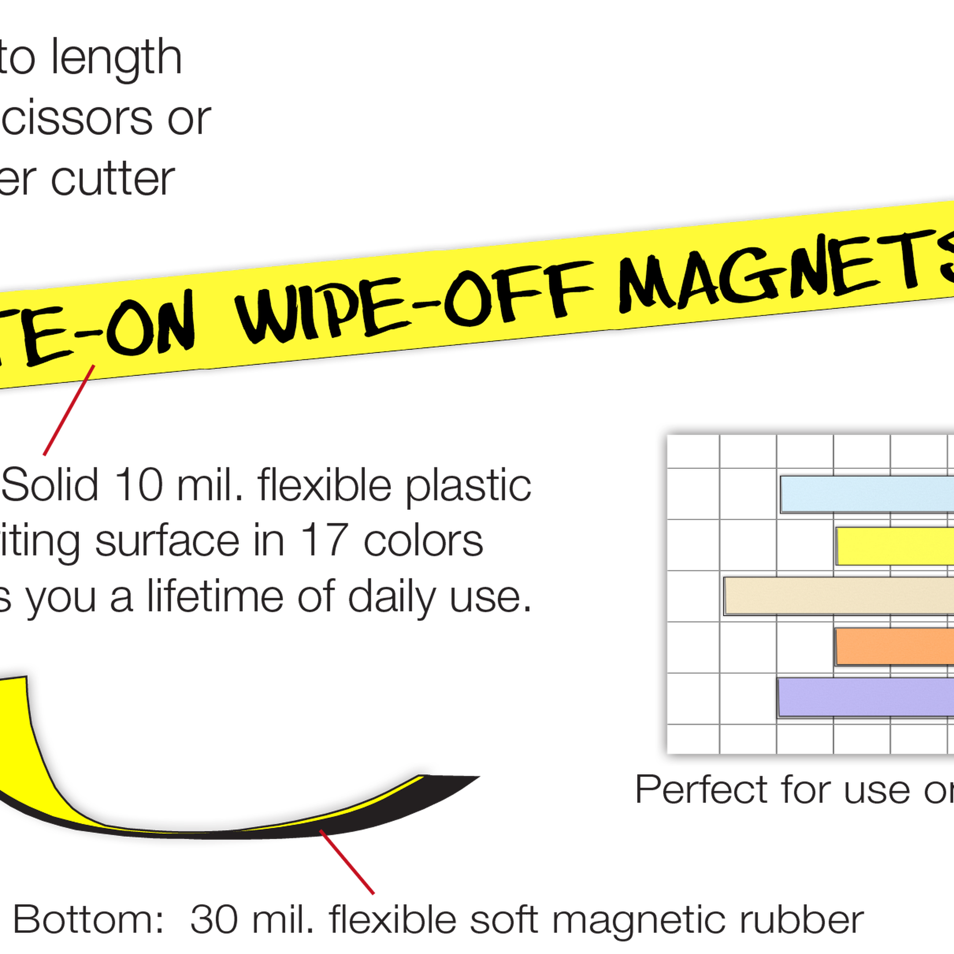 They are 40 mil (.04 inch) thick, with a solid 10 mil (.01 inch) hard flexible plastic writing surface laminated to strong 30 mil (.03 inch) permanently-magnetized soft flexible magnetic rubber. They have a hard, firm EasyGrip plastic edge. Order them in either damp-erase style with Matte non-smear, non-glare surface for use with damp-erase pens OR Dry-erase Glossy surface for use with whiteboard pens. They magnetically lock tight to the steel white board to prevent accidental sliding or dislodgment yet they lift easily for repositioning. They smoothly scissor-cut and stay tightly laminated with no loose edges.