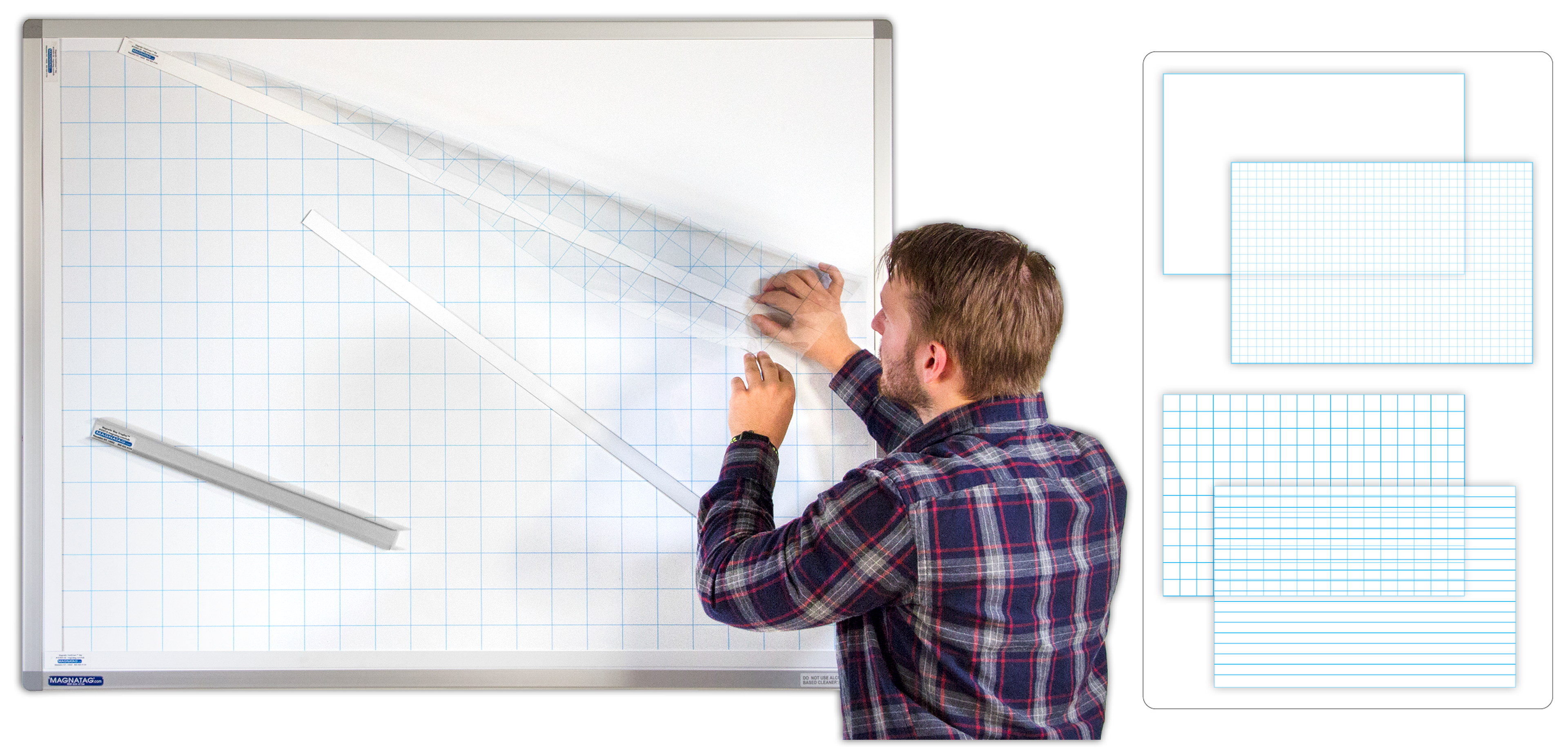 Magnetically laminate these films on plain steel whiteboards with our HoldDown™ Magnet Bar sets and convert it to a gridded or ruled board. Use magnets and write on the films with damp or dry-erase pens.