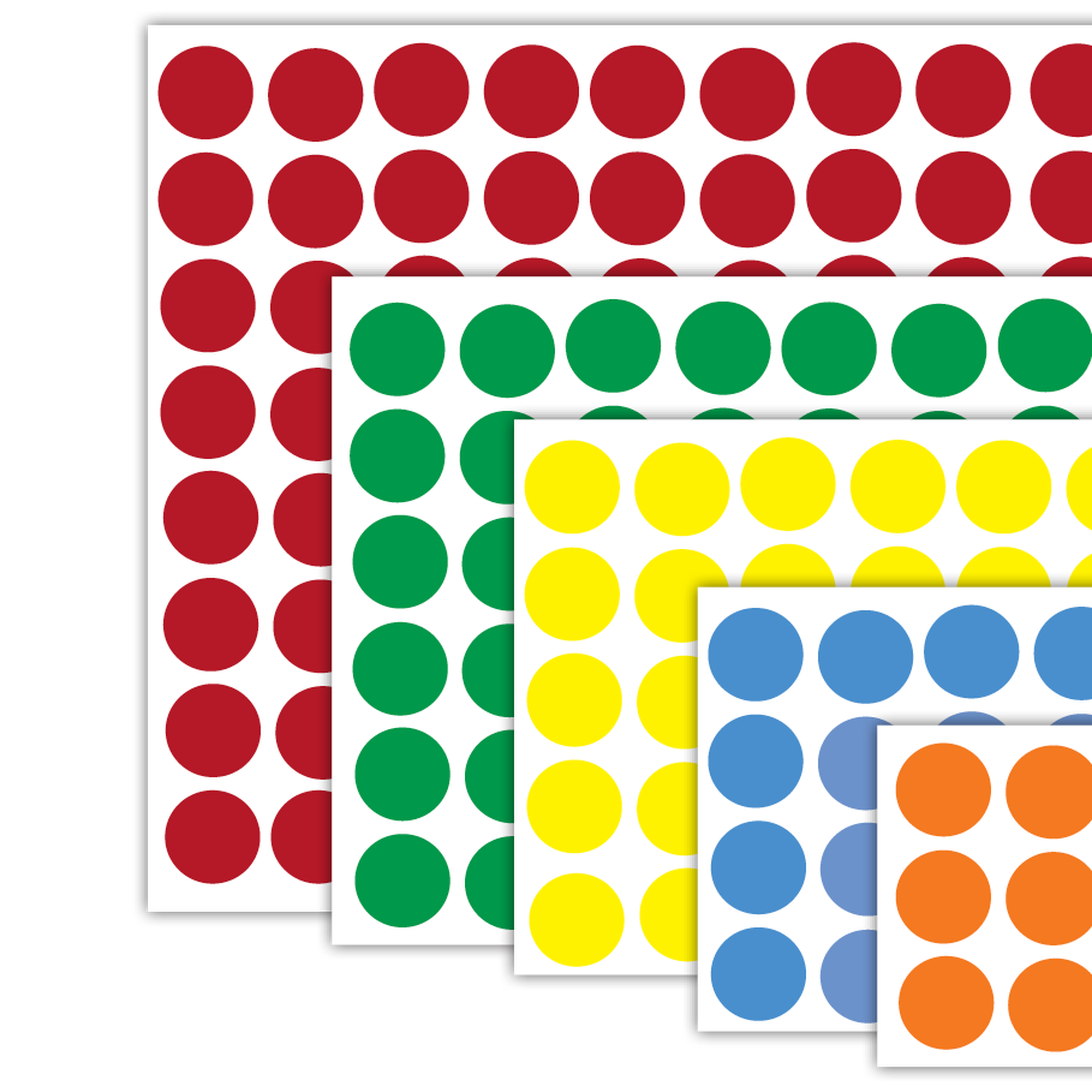 Press-on adhesive die-cut paper dots. Attach them to cards, file folders, documents, or anything that you want to color code for status for attention.