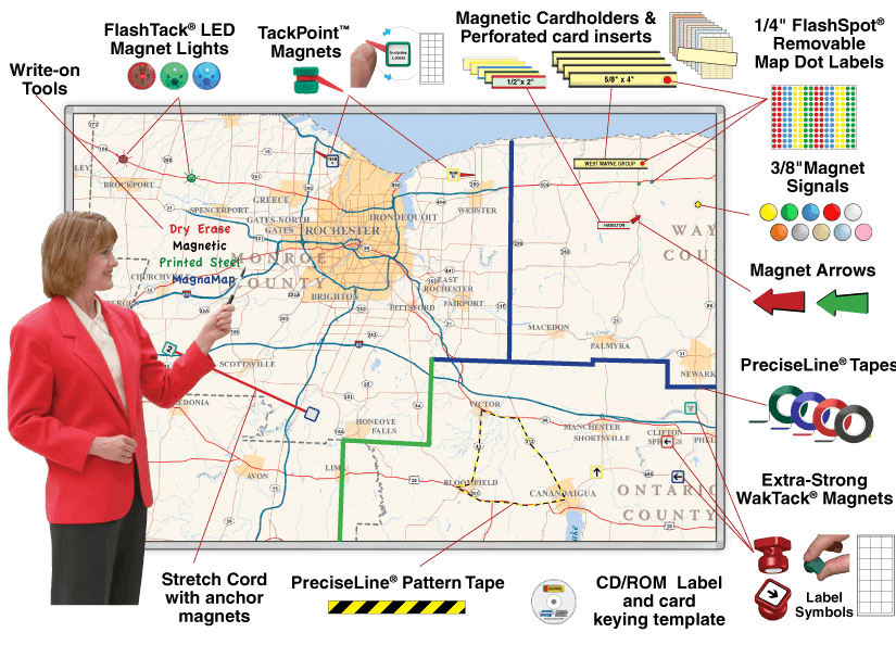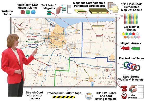 Printed steel dry-erase MagnaMaps® call for special Map-Magnets™ to pinpoint, outline and show your planned, updated and ongoing geo activity. Quickly show what's happening with these hands-on movable Map-Magnets™ and chart animation supplies.