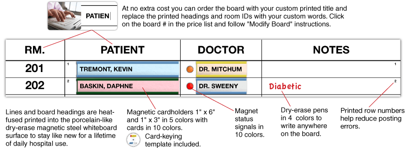 Ideal for arriving staff, visiting caregivers and ongoing patient data communication anywhere needed. It gives you patient-doctor data and patient notes at a glance with optional color-coded magnetic cardholders and magnet status signals. Includes our card-keying template for fast, neat preparation of patient names. The compact 3' h x 2' w size (31 patients) fits nicely in tight, visually restricted areas (behind doors, etc.). Dry-erase write on the board too in 4 colors. Each patient row is numbered at both ends to reduce errors in line posting. Includes press-on lettering and numbering for room numbers and board title.